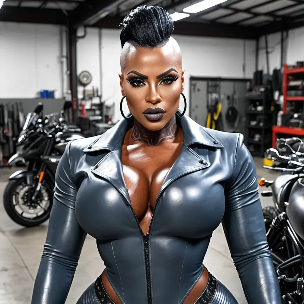 Generate Gorgeous female boss , light-hazel oval shaped eyes , very Dark-skinned African-American woman , bimbo , trimmed eyebrows pointy face , eyeliner , lipgloss , braided , futuristic mohawk designer , styled hair , bald on the side , black hair , bimbo , hourglass body , abnormally massive female bodybuilder , gorgeous , close up , full lips , big booty , bald on the side , face and breast , feminine silhouette , too big breast , big booty , sexy thighs abs , silhouette , up close , flexing biceps , strikingly beautiful hazel eyes , legs are iconic and defining physical feature , both visually and in terms of combat ability.wearing an outfit that is a striking blend of elegance , power , and femininity , designed to command attention in any room. The suit is tailored to perfection , hugging the wearer’s curves with precision while emphasizing a structured silhouette. The fabric itself is a refined grey tweed patterned with subtle white grid lines , giving the suit a texture that feels both sophisticated and modern. The blazer features broad blue lapels and gold button accents , adding a luxurious touch that elevates the look beyond typical business attire. The matching high-waisted trousers elongate the frame , further enhancing the poised and commanding effect of the ensemble.The styling choices amplify the boldness of the suit. The inner blouse is a silky , greybutton-down shirt that complements the tweed’s tone while introducing a softer , feminine balance to the sharp tailoring of the jacket. The blouse peeks out neatly from under the blazer , maintaining elegance without drawing focus away from the suit’s commanding cut. Accessories are kept minimal yet intentional: a delicate layered gold necklace and hoop earrings that add glimmers of light and luxury without overpowering the outfit. The choice of voluminous , honey-brown braids cascading down her shoulders frames the face with both confidence and glamour , completing the commanding visual.Altogether , this look communicates a blend of authority and allure. It is business-ready yet fashion-forward , balancing corporate structure with vibrant femininity. The color palette blue , grey and gold avoids being overly delicate , instead embracing the richness of texture , structure , and presence. This is the kind of ensemble that speaks to ambition , sophistication , and personal style—ideal for someone who thrives in positions of influence but insists on expressing her individuality with bold elegance. It’s not just clothing—it’s a statement of power wrapped in grace. In luxury living legs that could crush a watermelon , skirt high boots are a bold and striking statement piece , crafted in glossy black patent leather that gives them a sleek , polished finish. Rising to just below the knee , the boots feature three adjustable buckle straps along the shaft , adding both edge and detail to their design. The towering stiletto heel , paired with a thick platform sole , creates an ultra-dramatic silhouette that elongates the leg and exudes power and confidence. With their combination of shine , height , and structure , these boots perfectly balance fierce femininity with high-fashion allure , stunning face , honey eyes , enormous breast , full body shot , grey leather jacket and blue t-shirt , blue t-shirt , grey leather pants , standing by motorcycle in expensive , mechanic bay ,