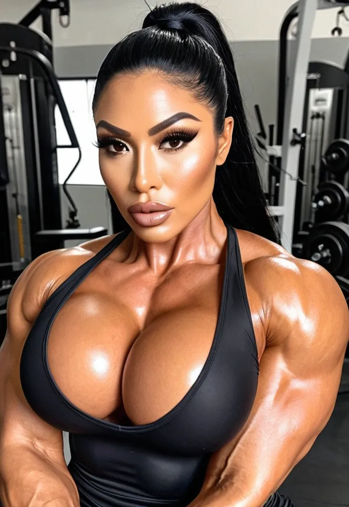 Generate Gorgeous female physical training nurse , bimbo , hourglass body , golden brown skim complexion. abnormally massive female bodybuilder , gorgeous , close up , full lips , big booty , black hair , Philippine woman , black pompadour stylish hair , feminine silhouette , too big breast , big booty , sexy thighs abs , silhouette , up close , flexing biceps , beautiful green eyes , legs are iconic and defining physical feature , both visually and in terms of combat ability.wearing an outfit that is a striking blend of elegance , power , and femininity , designed to command attention in any room. The suit is tailored to perfection , hugging the wearer’s curves with precision while emphasizing a structured silhouette. The fabric itself is a refined grey tweed patterned with subtle white grid lines , giving the suit a texture that feels both sophisticated and modern. The blazer features broad blue lapels and gold button accents , adding a luxurious touch that elevates the look beyond typical business attire. The matching high-waisted trousers elongate the frame , further enhancing the poised and commanding effect of the ensemble.The styling choices amplify the boldness of the suit. The inner blouse is a silky , greybutton-down shirt that complements the tweed’s tone while introducing a softer , feminine balance to the sharp tailoring of the jacket. The blouse peeks out neatly from under the blazer , maintaining elegance without drawing focus away from the suit’s commanding cut. Accessories are kept minimal yet intentional: a delicate layered gold necklace and hoop earrings that add glimmers of light and luxury without overpowering the outfit. The choice of voluminous , honey-brown braids cascading down her shoulders frames the face with both confidence and glamour , completing the commanding visual.Altogether , this look communicates a blend of authority and allure. It is business-ready yet fashion-forward , balancing corporate structure with vibrant femininity. The color palette blue , grey and gold avoids being overly delicate , instead embracing the richness of texture , structure , and presence. This is the kind of ensemble that speaks to ambition , sophistication , and personal style—ideal for someone who thrives in positions of influence but insists on expressing her individuality with bold elegance. It’s not just clothing—it’s a statement of power wrapped in grace. In luxury living legs that could crush a watermelon , skirt high boots are a bold and striking statement piece , crafted in glossy black patent leather that gives them a sleek , polished finish. Rising to just below the knee , the boots feature three adjustable buckle straps along the shaft , adding both edge and detail to their design. The towering stiletto heel , paired with a thick platform sole , creates an ultra-dramatic silhouette that elongates the leg and exudes power and confidence. With their combination of shine , height , and structure , these boots perfectly balance fierce femininity with high-fashion allure. High cheekbones , prominent jawline , gorgeous big brown eyes , powerful curves , enormous breast , sitting in physical training black scrubs , voluptuous , il up close shot , ,
