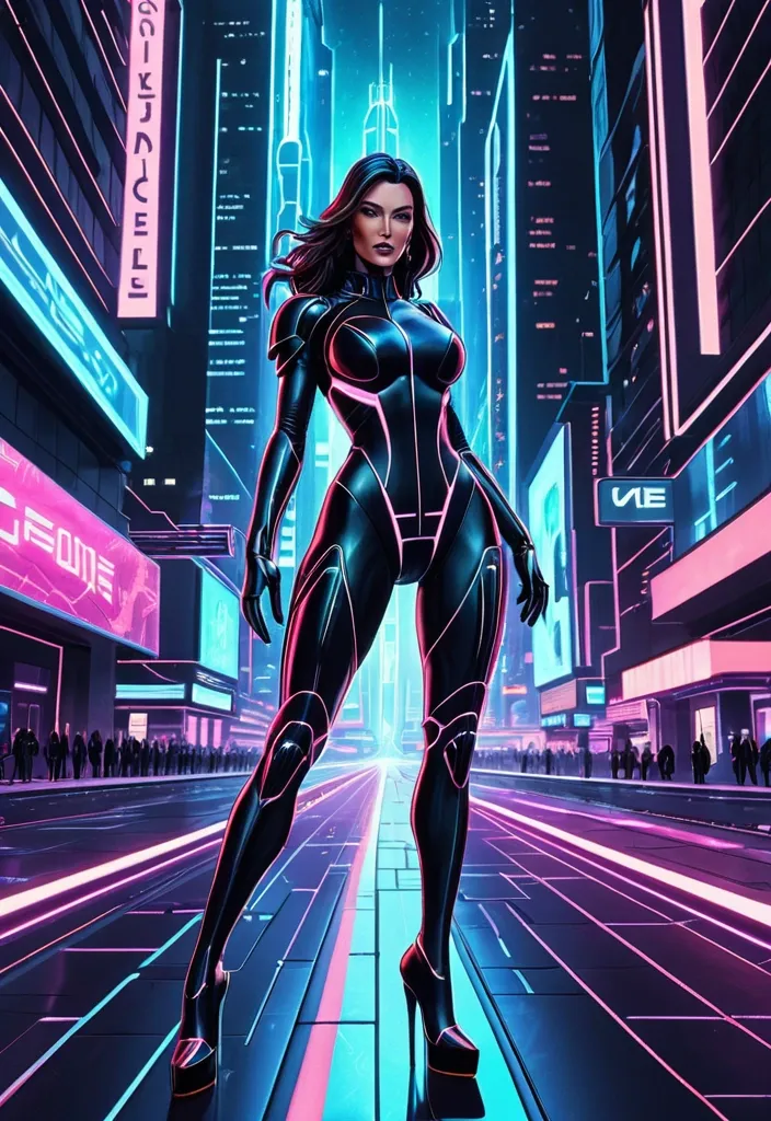A full-length of single young 18yo woman. 9:16 ratio. A confident and attractive young 18yo woman character. breathtaking illustration of Young 18yo woman Is wearing futuristic minimalism style costume , in a futuristic cityscape , holo ads , neon-lit streets , close up , , illustration , masterpiece , breathtaking illustration. Overall , it's an absolute world-class masterpiece illustration. It's an aesthetically pleasing illustration with impeccable attention to detail and impressive composition. ,