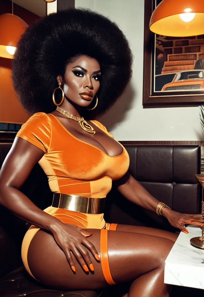Generate Gorgeous 24 years old , 1970s female boss , dark-skinned African-American woman , pointy face , bimbo , hourglass body , abnormally massive female bodybuilder , gorgeous , close up , full lips , big booty , 1970s Afro stylish , hoop earrings feminine silhouette , too big breast , big booty , sexy thighs abs , silhouette , up close , flexing biceps , beautiful brown eyes , legs are iconic and defining physical feature , both visually and in terms of combat ability.wearing an outfit that is a striking blend of elegance , power , and femininity , designed to command attention in any room. The suit is tailored to perfection , hugging the wearer’s curves with precision while emphasizing a structured silhouette. The fabric itself is a refined grey tweed patterned with subtle white grid lines , giving the suit a texture that feels both sophisticated and modern. The blazer features broad blue lapels and gold button accents , adding a luxurious touch that elevates the look beyond typical business attire. The matching high-waisted trousers elongate the frame , further enhancing the poised and commanding effect of the ensemble.The styling choices amplify the boldness of the suit. The inner blouse is a silky , greybutton-down shirt that complements the tweed’s tone while introducing a softer , feminine balance to the sharp tailoring of the jacket. The blouse peeks out neatly from under the blazer , maintaining elegance without drawing focus away from the suit’s commanding cut. Accessories are kept minimal yet intentional: a delicate layered gold necklace and hoop earrings that add glimmers of light and luxury without overpowering the outfit. The choice of voluminous , honey-brown braids cascading down her shoulders frames the face with both confidence and glamour , completing the commanding visual.Altogether , this look communicates a blend of authority and allure. It is business-ready yet fashion-forward , balancing corporate structure with vibrant femininity. The color palette blue , grey and gold avoids being overly delicate , instead embracing the richness of texture , structure , and presence. This is the kind of ensemble that speaks to ambition , sophistication , and personal style—ideal for someone who thrives in positions of influence but insists on expressing her individuality with bold elegance. It’s not just clothing—it’s a statement of power wrapped in grace. In luxury living legs that could crush a watermelon , skirt high boots are a bold and striking statement piece , crafted in glossy black patent leather that gives them a sleek , polished finish. Rising to just below the knee , the boots feature three adjustable buckle straps along the shaft , adding both edge and detail to their design. The towering stiletto heel , paired with a thick platform sole , creates an ultra-dramatic silhouette that elongates the leg and exudes power and confidence. With their combination of shine , height , and structure , these boots perfectly balance fierce femininity with high-fashion allure. High cheekbones , prominent jawline , gorgeous big brown light hazel honey , , enormous breast , orange velvet t-shirt , gold futuristic necklace , grey designer skirt sitting in a booth in 1970 styles restaurant enormous breast , enormous butt , massive cleavage ,