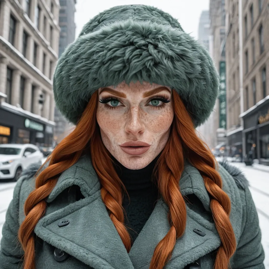 Generate Gorgeous female boss , bimbo , hourglass body , abnormally massive female bodybuilder , gorgeous , close up , full lips , big booty , redheaded , freckles on face and breast , braided design hair , feminine silhouette , too big breast , big booty , sexy thighs abs , silhouette , up close , flexing biceps , beautiful green eyes , legs are iconic and defining physical feature , both visually and in terms of combat ability.wearing an outfit that is a striking blend of elegance , power , and femininity , designed to command attention in any room. The suit is tailored to perfection , hugging the wearer’s curves with precision while emphasizing a structured silhouette. The fabric itself is a refined grey tweed patterned with subtle white grid lines , giving the suit a texture that feels both sophisticated and modern. The blazer features broad blue lapels and gold button accents , adding a luxurious touch that elevates the look beyond typical business attire. The matching high-waisted trousers elongate the frame , further enhancing the poised and commanding effect of the ensemble.The styling choices amplify the boldness of the suit. The inner blouse is a silky , greybutton-down shirt that complements the tweed’s tone while introducing a softer , feminine balance to the sharp tailoring of the jacket. The blouse peeks out neatly from under the blazer , maintaining elegance without drawing focus away from the suit’s commanding cut. Accessories are kept minimal yet intentional: a delicate layered gold necklace and hoop earrings that add glimmers of light and luxury without overpowering the outfit. The choice of voluminous , honey-brown braids cascading down her shoulders frames the face with both confidence and glamour , completing the commanding visual.Altogether , this look communicates a blend of authority and allure. It is business-ready yet fashion-forward , balancing corporate structure with vibrant femininity. The color palette blue , grey and gold avoids being overly delicate , instead embracing the richness of texture , structure , and presence. This is the kind of ensemble that speaks to ambition , sophistication , and personal style—ideal for someone who thrives in positions of influence but insists on expressing her individuality with bold elegance. It’s not just clothing—it’s a statement of power wrapped in grace. In luxury living legs that could crush a watermelon , skirt high boots are a bold and striking statement piece , crafted in glossy black patent leather that gives them a sleek , polished finish. Rising to just below the knee , the boots feature three adjustable buckle straps along the shaft , adding both edge and detail to their design. The towering stiletto heel , paired with a thick platform sole , creates an ultra-dramatic silhouette that elongates the leg and exudes power and confidence. With their combination of shine , height , and structure , these boots perfectly balance fierce femininity with high-fashion allure. , gorgeous green eyes. Freckles , scowl on face , charcoal grey fluffy fur trench coat and fluffy hat in Dream City snowy city ,