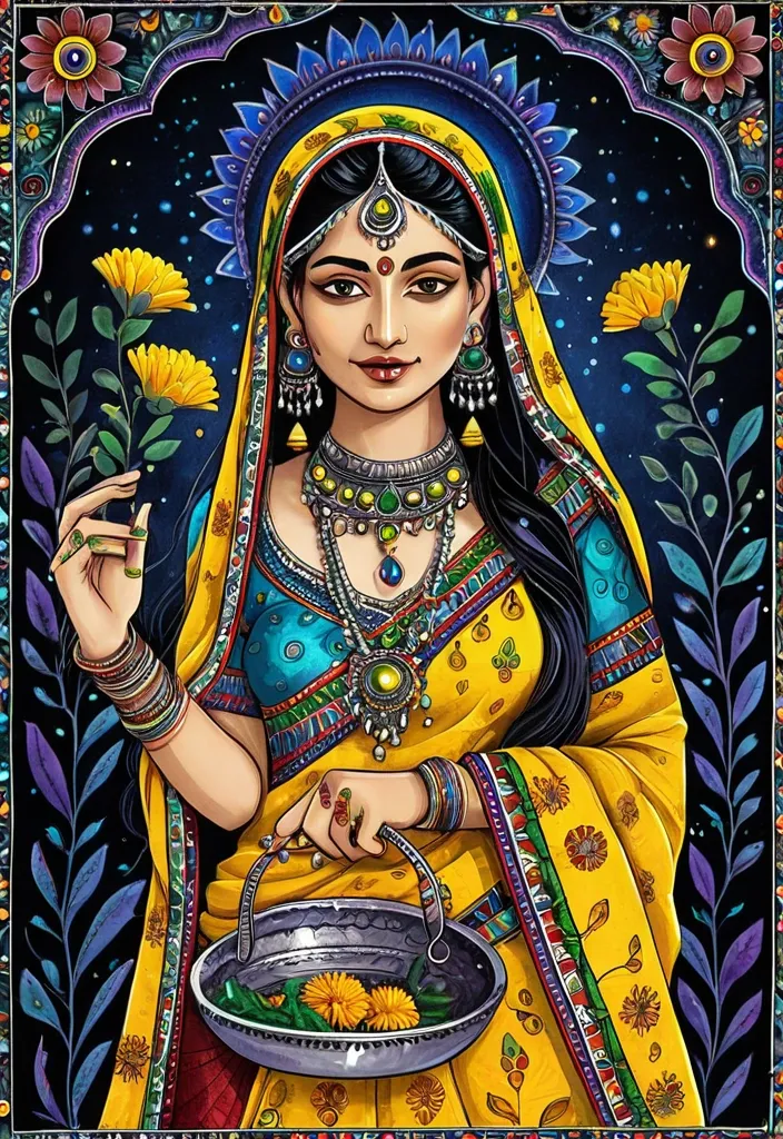 Madhubani art style , unique and spectacular ink design , a woman stands. Her ensemble features intricate embellishments and a flowing dupatta that frames her face , accentuated by delicate ear ornaments and a subtle bindi adorning her forehead. In her hands , she carries a silver platter adorned with bright yellow marigold flowers , symbolizing festivity , alongside a beautifully decorated pot , possibly for a ritual , fantasy art , vibrant colors , blue , green , yellow , purple , red , intricate details , black pearl background , ethereal glow , lush foliage , romantic ambiance , spiritual harmony. ,