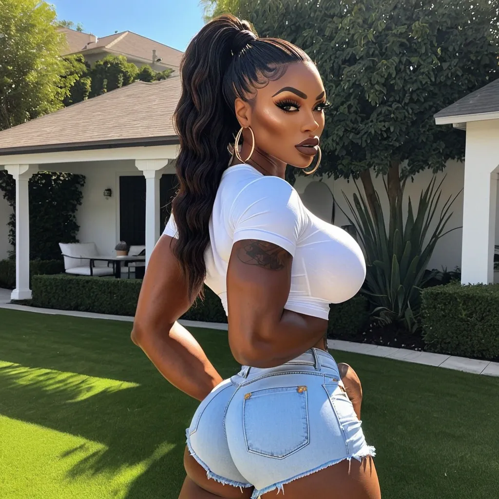 Generate Gorgeous female boss , bimbo , dark-skinned very African-American female , hourglass body , abnormally massive female bodybuilder , gorgeous , close up , full lips , big booty , brown , ponytail braids , on face and breast , braided styled mohawk , bald on the side , shaved on the side , feminine silhouette , too big breast , big booty , sexy thighs abs , silhouette , up close , flexing biceps , beautiful green eyes , legs are iconic and defining physical feature , both visually and in terms of combat ability.wearing an outfit that is a striking blend of elegance , power , and femininity , designed to command attention in any room. The suit is tailored to perfection , hugging the wearer’s curves with precision while emphasizing a structured silhouette. The fabric itself is a refined grey tweed patterned with subtle white grid lines , giving the suit a texture that feels both sophisticated and modern. The blazer features broad blue lapels and gold button accents , adding a luxurious touch that elevates the look beyond typical business attire. The matching high-waisted trousers elongate the frame , further enhancing the poised and commanding effect of the ensemble.The styling choices amplify the boldness of the suit. The inner blouse is a silky , greybutton-down shirt that complements the tweed’s tone while introducing a softer , feminine balance to the sharp tailoring of the jacket. The blouse peeks out neatly from under the blazer , maintaining elegance without drawing focus away from the suit’s commanding cut. Accessories are kept minimal yet intentional: a delicate layered gold necklace and hoop earrings that add glimmers of light and luxury without overpowering the outfit. The choice of voluminous , honey-brown braids cascading down her shoulders frames the face with both confidence and glamour , completing the commanding visual.Altogether , this look communicates a blend of authority and allure. It is business-ready yet fashion-forward , balancing corporate structure with vibrant femininity. The color palette blue , grey and gold avoids being overly delicate , instead embracing the richness of texture , structure , and presence. This is the kind of ensemble that speaks to ambition , sophistication , and personal style—ideal for someone who thrives in positions of influence but insists on expressing her individuality with bold elegance. It’s not just clothing—it’s a statement of power wrapped in grace. In luxury living legs that could crush a watermelon , skirt high boots are a bold and striking statement piece , crafted in glossy black patent leather that gives them a sleek , polished finish. Rising to just below the knee , the boots feature three adjustable buckle straps along the shaft , adding both edge and detail to their design. The towering stiletto heel , paired with a thick platform sole , creates an ultra-dramatic silhouette that elongates the leg and exudes power and confidence. With their combination of shine , height , and structure , these boots perfectly balance fierce femininity with high-fashion allure. High cheekbones , prominent jawline , gorgeous big light reflecting hazel eyes , enormous breast , cartoon bunny on yellow t-shirt-shirt , denim shorts , denim baseball cap walking in amusement park , full body profile shot , enormous butt , enormous breast , thunder thighs and hips ,