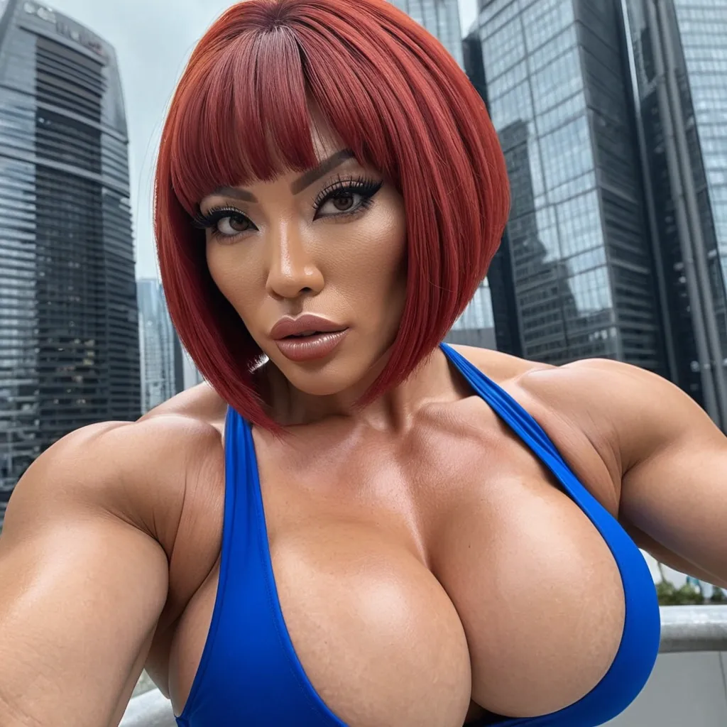 Generate Gorgeous female boss , bimbo , hourglass body , Japanese woman , abnormally massive female bodybuilder , gorgeous , close up , full lips , big booty , red hair , short bob-cut hair , , feminine silhouette , too big breast , big booty , sexy thighs abs , silhouette , up close , flexing biceps , beautiful brown eyes , legs are iconic and defining physical feature , both visually and in terms of combat ability.wearing an outfit that is a striking blend of elegance , power , and femininity , designed to command attention in any room. The suit is tailored to perfection , hugging the wearer’s curves with precision while emphasizing a structured silhouette. The fabric itself is a refined grey tweed patterned with subtle white grid lines , giving the suit a texture that feels both sophisticated and modern. The blazer features broad blue lapels and gold button accents , adding a luxurious touch that elevates the look beyond typical business attire. The matching high-waisted trousers elongate the frame , further enhancing the poised and commanding effect of the ensemble.The styling choices amplify the boldness of the suit. The inner blouse is a silky , greybutton-down shirt that complements the tweed’s tone while introducing a softer , feminine balance to the sharp tailoring of the jacket. The blouse peeks out neatly from under the blazer , maintaining elegance without drawing focus away from the suit’s commanding cut. Accessories are kept minimal yet intentional: a delicate layered gold necklace and hoop earrings that add glimmers of light and luxury without overpowering the outfit. The choice of voluminous , honey-brown braids cascading down her shoulders frames the face with both confidence and glamour , completing the commanding visual.Altogether , this look communicates a blend of authority and allure. It is business-ready yet fashion-forward , balancing corporate structure with vibrant femininity. The color palette blue , grey and gold avoids being overly delicate , instead embracing the richness of texture , structure , and presence. This is the kind of ensemble that speaks to ambition , sophistication , and personal style—ideal for someone who thrives in positions of influence but insists on expressing her individuality with bold elegance. It’s not just clothing—it’s a statement of power wrapped in grace. In luxury living legs that could crush a watermelon , skirt high boots are a bold and striking statement piece , crafted in glossy black patent leather that gives them a sleek , polished finish. Rising to just below the knee , the boots feature three adjustable buckle straps along the shaft , adding both edge and detail to their design. The towering stiletto heel , paired with a thick platform sole , creates an ultra-dramatic silhouette that elongates the leg and exudes power and confidence. With their combination of shine , height , and structure , these boots perfectly balance fierce femininity with high-fashion allure. High cheekbones , prominent jawline , gorgeous big brown eyes , enormous breast , blue tank top , high rise grey short , enormous butt , up close shot ,