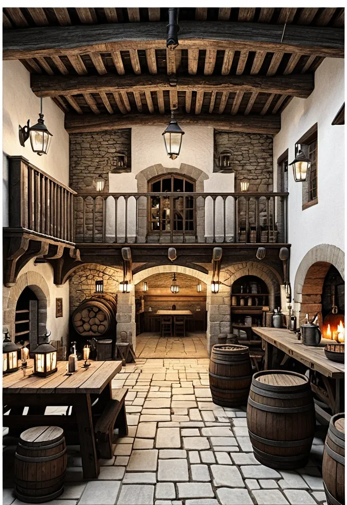 17th Century Serbian Tavern Map , top down D&D style full coloured unlabeled floorplan , rustic timber and stone building , shingled roof , large common room with wooden tables and benches , central hearth and fireplace , bar counter with barrels and shelves , side storage room with casks , small kitchen with stone oven , private back room for guests , narrow wooden staircase to loft sleeping area with straw beds , lanterns and candles providing light , courtyard with well and hitching post , Ultra Detailed , White Background , 4k , Digital Painting ,