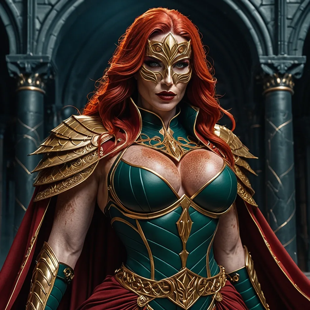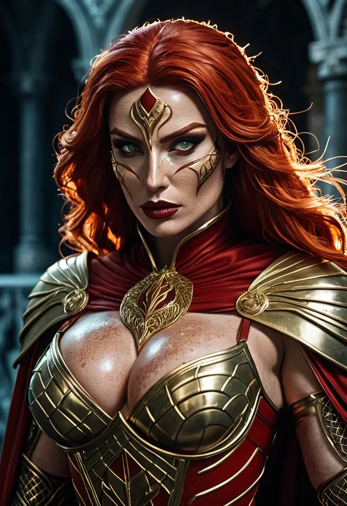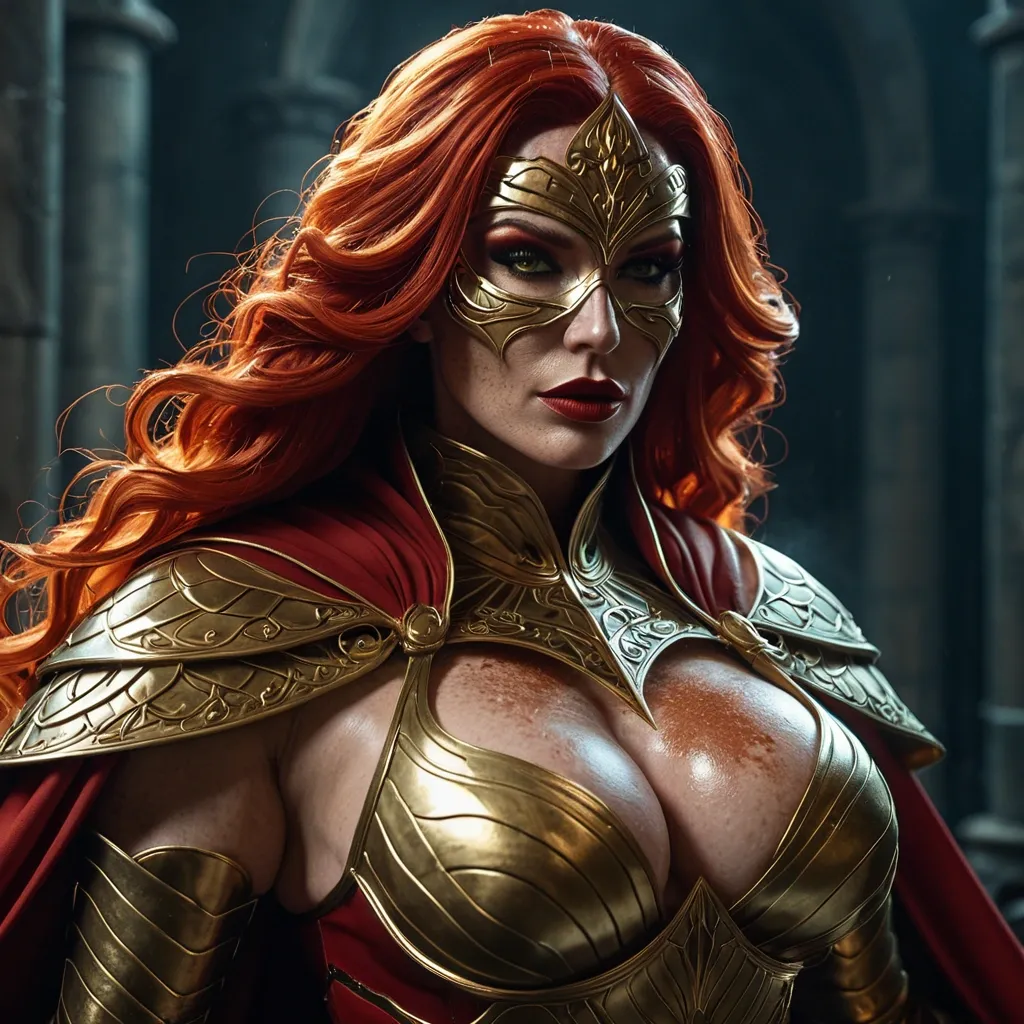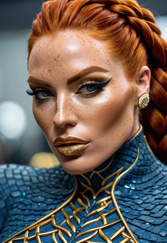Generate Gorgeous female boss , bimbo , hourglass body , abnormally massive female bodybuilder , gorgeous , close up , full lips , big booty , redheaded , freckles on face and breast , braided design hair , feminine silhouette , too big breast , big booty , sexy thighs abs , silhouette , up close , flexing biceps , beautiful green eyes , legs are iconic and defining physical feature , both visually and in terms of combat ability.wearing an outfit that is a striking blend of elegance , power , and femininity , designed to command attention in any room. The suit is tailored to perfection , hugging the wearer’s curves with precision while emphasizing a structured silhouette. The fabric itself is a refined grey tweed patterned with subtle white grid lines , giving the suit a texture that feels both sophisticated and modern. The blazer features broad blue lapels and gold button accents , adding a luxurious touch that elevates the look beyond typical business attire. The matching high-waisted trousers elongate the frame , further enhancing the poised and commanding effect of the ensemble.The styling choices amplify the boldness of the suit. The inner blouse is a silky , greybutton-down shirt that complements the tweed’s tone while introducing a softer , feminine balance to the sharp tailoring of the jacket. The blouse peeks out neatly from under the blazer , maintaining elegance without drawing focus away from the suit’s commanding cut. Accessories are kept minimal yet intentional: a delicate layered gold necklace and hoop earrings that add glimmers of light and luxury without overpowering the outfit. The choice of voluminous , honey-brown braids cascading down her shoulders frames the face with both confidence and glamour , completing the commanding visual.Altogether , this look communicates a blend of authority and allure. It is business-ready yet fashion-forward , balancing corporate structure with vibrant femininity. The color palette blue , grey and gold avoids being overly delicate , instead embracing the richness of texture , structure , and presence. This is the kind of ensemble that speaks to ambition , sophistication , and personal style—ideal for someone who thrives in positions of influence but insists on expressing her individuality with bold elegance. It’s not just clothing—it’s a statement of power wrapped in grace.She stands like judgment made flesh , a vision of lethal elegance wrapped in a deep midnight-blue leather bodysuit that fits like liquid armor. The hard leather has been masterfully sculpted and paneled with subtle gold piping that traces every curve , accentuating an athletic yet unmistakably feminine silhouette: broad shoulders tapering to a narrow waist , then flaring into powerful hips and long , strong legs. The leather itself has a faint metallic sheen under the light , giving it an almost wet-look intensity while remaining thick and battle-ready. Across her chest , a bold golden eagle spreads its wings in raised , mirror-polished relief (fierce , regal , and unmistakably feminine in its sweeping lines. The emblem sits high and proud , drawing the eye while the surrounding gold filigree frames and flatters her figure. A long , dramatic cape of the same midnight blue flows from her shoulders , lined in a rich blood-crimson silk that flashes like a wound whenever she moves. The cape is weighted at the hem with subtle gold embroidery of tiny scales of justice , so it billows with cinematic menace rather than flapping uselessly. Her hood is deep and pointed , framing her face in shadow and mystery. It connects seamlessly to a half-mask of the same hard leather , gold-trimmed leather that covers the upper half of her face , leaving only a sharp cutout for her eyes. Those eyes are a breathtaking emerald green , almost luminous against her pale , freckle-dusted skin. Fiery red hair spills out from beneath the hood in thick , slightly wild waves that catch the light like molten copper , a few rebellious strands brushing across her high cheekbones. Her lips (full , naturally scarlet , and set in a perpetual half-smirk) are the only other part of her face left bare , giving her an air of dangerous allure beneath the intimidation. Gold gauntlets with subtle scale motifs wrap her forearms , and climb to her elbows , matching the heavy gold belt that cinches her waist and bears a raised emblem of balanced scales at the center. Every piece is crafted to look both regal and unforgiving , the outfit of a woman who keeps her promises the hard way. ,