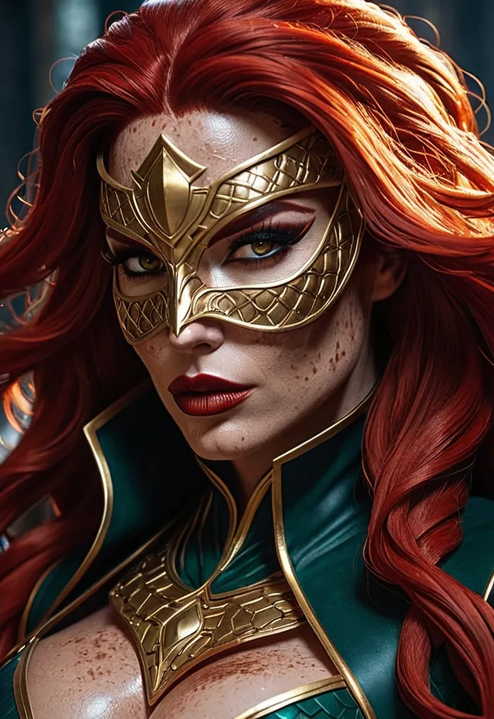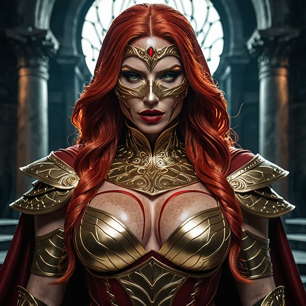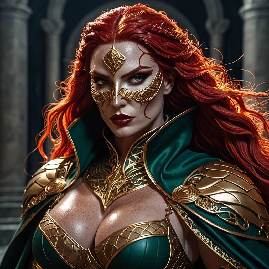 Generate Gorgeous female boss , bimbo , hourglass body , abnormally massive female bodybuilder , gorgeous , close up , full lips , big booty , redheaded , freckles on face and breast , braided design hair , feminine silhouette , too big breast , big booty , sexy thighs abs , silhouette , up close , flexing biceps , beautiful green eyes , legs are iconic and defining physical feature , both visually and in terms of combat ability.wearing an outfit that is a striking blend of elegance , power , and femininity , designed to command attention in any room. The suit is tailored to perfection , hugging the wearer’s curves with precision while emphasizing a structured silhouette. The fabric itself is a refined grey tweed patterned with subtle white grid lines , giving the suit a texture that feels both sophisticated and modern. The blazer features broad blue lapels and gold button accents , adding a luxurious touch that elevates the look beyond typical business attire. The matching high-waisted trousers elongate the frame , further enhancing the poised and commanding effect of the ensemble.The styling choices amplify the boldness of the suit. The inner blouse is a silky , greybutton-down shirt that complements the tweed’s tone while introducing a softer , feminine balance to the sharp tailoring of the jacket. The blouse peeks out neatly from under the blazer , maintaining elegance without drawing focus away from the suit’s commanding cut. Accessories are kept minimal yet intentional: a delicate layered gold necklace and hoop earrings that add glimmers of light and luxury without overpowering the outfit. The choice of voluminous , honey-brown braids cascading down her shoulders frames the face with both confidence and glamour , completing the commanding visual.Altogether , this look communicates a blend of authority and allure. It is business-ready yet fashion-forward , balancing corporate structure with vibrant femininity. The color palette blue , grey and gold avoids being overly delicate , instead embracing the richness of texture , structure , and presence. This is the kind of ensemble that speaks to ambition , sophistication , and personal style—ideal for someone who thrives in positions of influence but insists on expressing her individuality with bold elegance. It’s not just clothing—it’s a statement of power wrapped in grace.She stands like judgment made flesh , a vision of lethal elegance wrapped in a deep midnight-blue leather bodysuit that fits like liquid armor. The hard leather has been masterfully sculpted and paneled with subtle gold piping that traces every curve , accentuating an athletic yet unmistakably feminine silhouette: broad shoulders tapering to a narrow waist , then flaring into powerful hips and long , strong legs. The leather itself has a faint metallic sheen under the light , giving it an almost wet-look intensity while remaining thick and battle-ready. Across her chest , a bold golden eagle spreads its wings in raised , mirror-polished relief (fierce , regal , and unmistakably feminine in its sweeping lines. The emblem sits high and proud , drawing the eye while the surrounding gold filigree frames and flatters her figure. A long , dramatic cape of the same midnight blue flows from her shoulders , lined in a rich blood-crimson silk that flashes like a wound whenever she moves. The cape is weighted at the hem with subtle gold embroidery of tiny scales of justice , so it billows with cinematic menace rather than flapping uselessly. Her hood is deep and pointed , framing her face in shadow and mystery. It connects seamlessly to a half-mask of the same hard leather , gold-trimmed leather that covers the upper half of her face , leaving only a sharp cutout for her eyes. Those eyes are a breathtaking emerald green , almost luminous against her pale , freckle-dusted skin. Fiery red hair spills out from beneath the hood in thick , slightly wild waves that catch the light like molten copper , a few rebellious strands brushing across her high cheekbones. Her lips (full , naturally scarlet , and set in a perpetual half-smirk) are the only other part of her face left bare , giving her an air of dangerous allure beneath the intimidation. Gold gauntlets with subtle scale motifs wrap her forearms , and climb to her elbows , matching the heavy gold belt that cinches her waist and bears a raised emblem of balanced scales at the center. Every piece is crafted to look both regal and unforgiving , the outfit of a woman who keeps her promises the hard way. ,