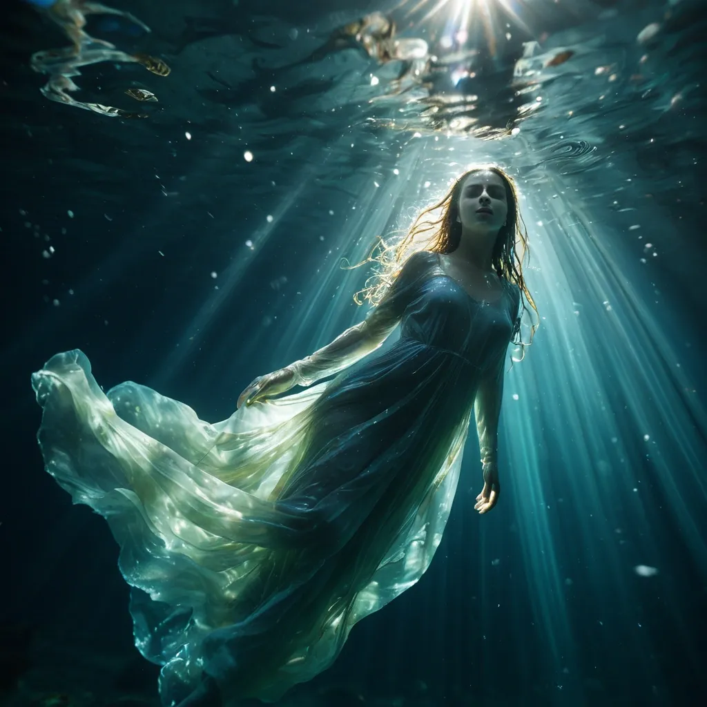 Underwater series /// High detail RAW color photo professional , highly detail face: 1.4 , a detailed portrait of a woman floating underwater wearing long flowing dress , nymph style , amazing underwater , detailed skin , wet clothes , wet hair , see-through clothes , lens flare , shade , tindal effect , lens flare , backlighting , bokeh ,