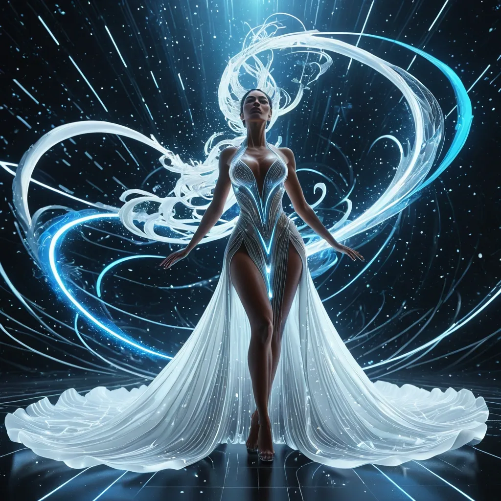 A breathtaking digital masterpiece of a cosmic primordial dance girl with Dynamic pose in three-dimensional light style of white gown , creating a dramatic and visually striking effect. Bead blast and citrus blue Beads design , powerful dynamic composition. Style: Celestial , ethereal , abstract , digital art smoking: Dramatic backlighting , transparent dots-lines , contrasting dark background Composition: dynamic diagonal composition , upward gaze Details: Sparkling white waves and smoke , streaking white light trails , sense of movement and wonder , magical atmosphere Quality: High detail , 4K , Masterpiece , Rendered in Octane ,
