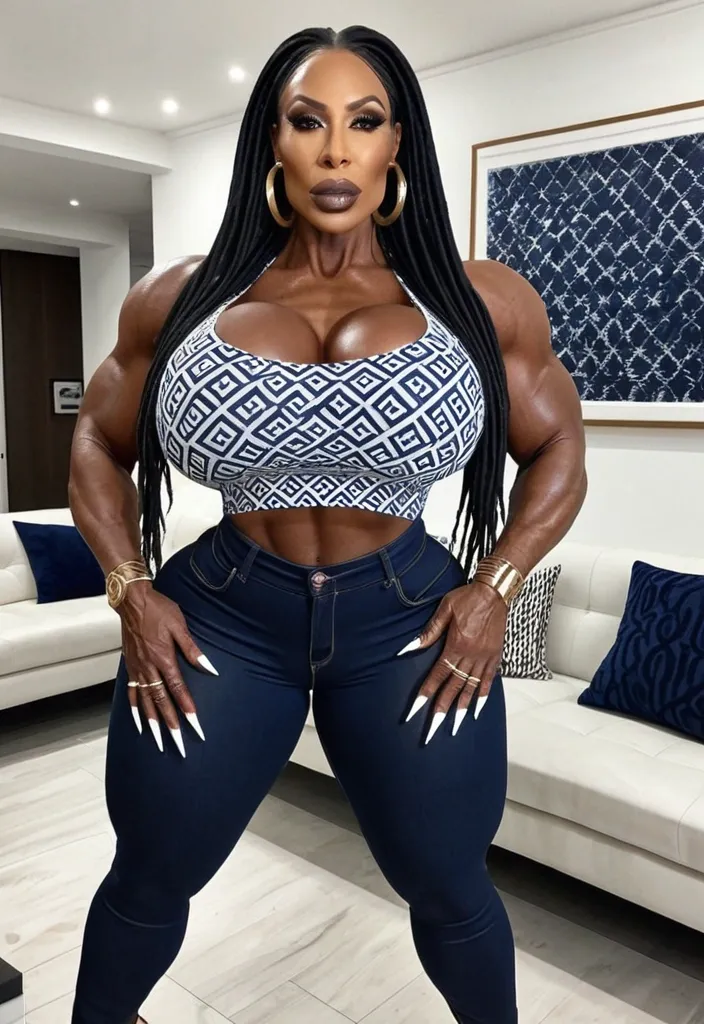 Generate Gorgeous female boss , bimbo , 47 years old , very dark-skinned African-American woman , brown dreadlocks , hourglass body , abnormally massive female bodybuilder , gorgeous , close up , full lips , big booty , dark brown eyes , very big plump lips , feminine silhouette , too big breast , big booty , sexy thighs abs , silhouette , up close , flexing biceps , big gorgeous light brown eyes , legs are iconic and defining physical feature , both visually and in terms of combat ability.wearing an outfit that is a striking blend of elegance , power , and femininity , designed to command attention in any room. The suit is tailored to perfection , hugging the wearer’s curves with precision while emphasizing a structured silhouette. The fabric itself is a refined grey tweed patterned with subtle white grid lines , giving the suit a texture that feels both sophisticated and modern. The blazer features broad blue lapels and gold button accents , adding a luxurious touch that elevates the look beyond typical business attire. The matching high-waisted trousers elongate the frame , further enhancing the poised and commanding effect of the ensemble.The styling choices amplify the boldness of the suit. The inner blouse is a silky , greybutton-down shirt that complements the tweed’s tone while introducing a softer , feminine balance to the sharp tailoring of the jacket. The blouse peeks out neatly from under the blazer , maintaining elegance without drawing focus away from the suit’s commanding cut. Accessories are kept minimal yet intentional: a delicate layered gold necklace and hoop earrings that add glimmers of light and luxury without overpowering the outfit. The choice of voluminous , honey-brown braids cascading down her shoulders frames the face with both confidence and glamour , completing the commanding visual.Altogether , this look communicates a blend of authority and allure. It is business-ready yet fashion-forward , balancing corporate structure with vibrant femininity. The color palette blue , grey and gold avoids being overly delicate , instead embracing the richness of texture , structure , and presence. This is the kind of ensemble that speaks to ambition , sophistication , and personal style—ideal for someone who thrives in positions of influence but insists on expressing her individuality with bold elegance. It’s not just clothing—it’s a statement of power wrapped in grace. In luxury living legs that could crush a watermelon , skirt high boots are a bold and striking statement piece , crafted in glossy black patent leather that gives them a sleek , polished finish. Rising to just below the knee , the boots feature three adjustable buckle straps along the shaft , adding both edge and detail to their design. The towering stiletto heel , paired with a thick platform sole , creates an ultra-dramatic silhouette that elongates the leg and exudes power and confidence. With their combination of shine , height , and structure , these boots perfectly balance fierce femininity with high-fashion allure. Massive breast , massive cleavage , driving and standing in living room , wearing a white , dark navy blue and black accented subtle symmetrical patterned t-shirt , black denim pants , enormous butt ,