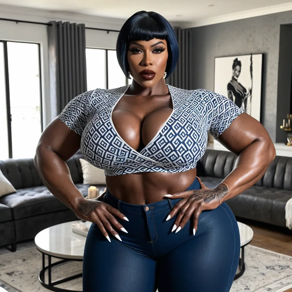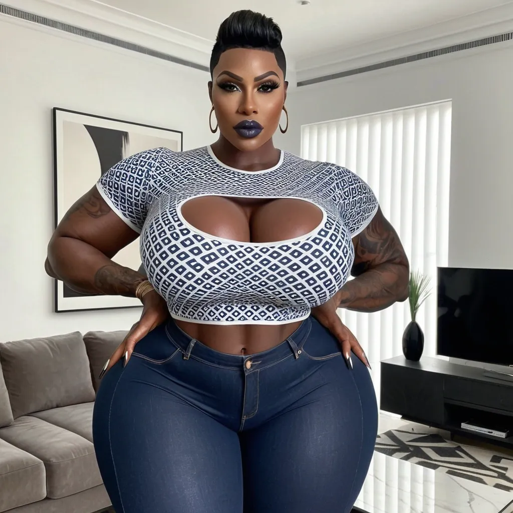 Generate Gorgeous female boss , bimbo , very dark-skinned African-American woman , short , pixie hair , hourglass body , abnormally massive female bodybuilder , gorgeous , close up , full lips , big booty , dark brown eyes , very big plump lips , feminine silhouette , too big breast , big booty , sexy thighs abs , silhouette , up close , flexing biceps , big gorgeous light brown eyes , legs are iconic and defining physical feature , both visually and in terms of combat ability.wearing an outfit that is a striking blend of elegance , power , and femininity , designed to command attention in any room. The suit is tailored to perfection , hugging the wearer’s curves with precision while emphasizing a structured silhouette. The fabric itself is a refined grey tweed patterned with subtle white grid lines , giving the suit a texture that feels both sophisticated and modern. The blazer features broad blue lapels and gold button accents , adding a luxurious touch that elevates the look beyond typical business attire. The matching high-waisted trousers elongate the frame , further enhancing the poised and commanding effect of the ensemble.The styling choices amplify the boldness of the suit. The inner blouse is a silky , greybutton-down shirt that complements the tweed’s tone while introducing a softer , feminine balance to the sharp tailoring of the jacket. The blouse peeks out neatly from under the blazer , maintaining elegance without drawing focus away from the suit’s commanding cut. Accessories are kept minimal yet intentional: a delicate layered gold necklace and hoop earrings that add glimmers of light and luxury without overpowering the outfit. The choice of voluminous , honey-brown braids cascading down her shoulders frames the face with both confidence and glamour , completing the commanding visual.Altogether , this look communicates a blend of authority and allure. It is business-ready yet fashion-forward , balancing corporate structure with vibrant femininity. The color palette blue , grey and gold avoids being overly delicate , instead embracing the richness of texture , structure , and presence. This is the kind of ensemble that speaks to ambition , sophistication , and personal style—ideal for someone who thrives in positions of influence but insists on expressing her individuality with bold elegance. It’s not just clothing—it’s a statement of power wrapped in grace. In luxury living legs that could crush a watermelon , skirt high boots are a bold and striking statement piece , crafted in glossy black patent leather that gives them a sleek , polished finish. Rising to just below the knee , the boots feature three adjustable buckle straps along the shaft , adding both edge and detail to their design. The towering stiletto heel , paired with a thick platform sole , creates an ultra-dramatic silhouette that elongates the leg and exudes power and confidence. With their combination of shine , height , and structure , these boots perfectly balance fierce femininity with high-fashion allure. Massive breast , massive cleavage , driving and standing in living room , wearing a white , dark navy blue and black accented subtle symmetrical patterned t-shirt , black denim pants , enormous butt She puts her hands out doing a pinching jester ,
