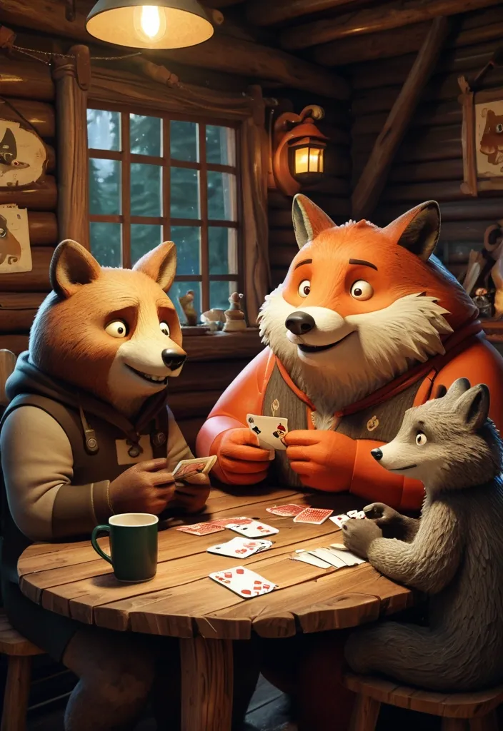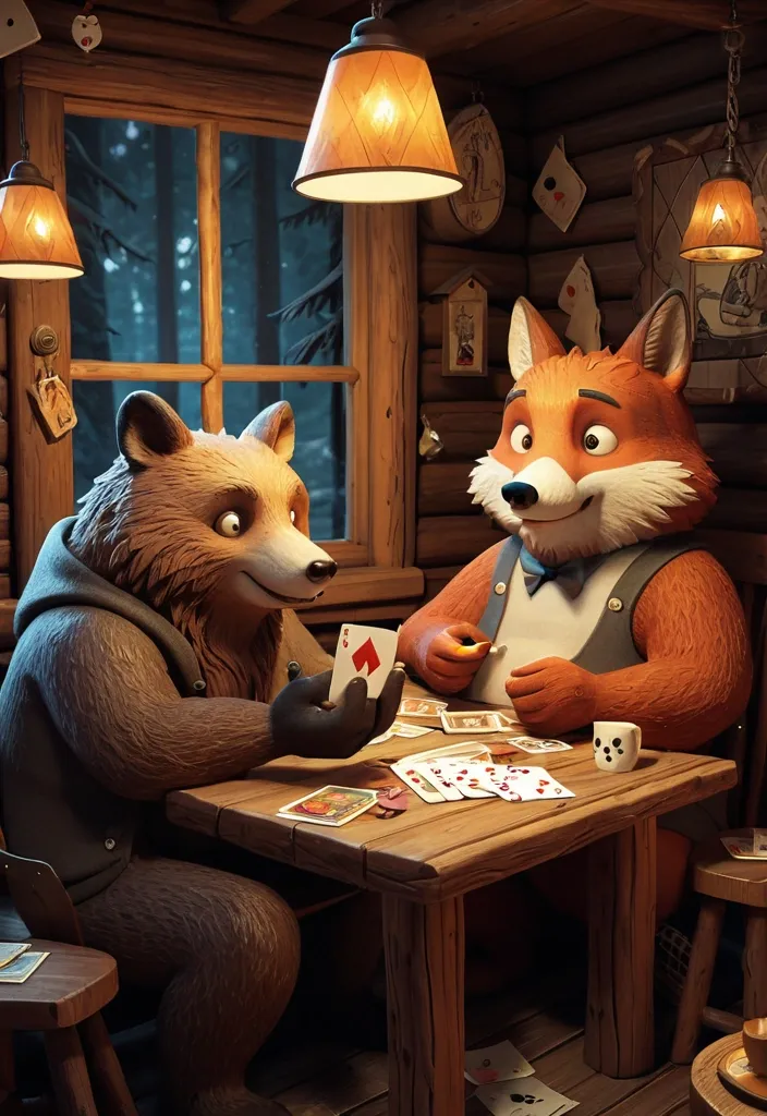 A whimsical and detailed illustration of three anthropomorphic forest animals sitting at a wooden table playing cards in a cozy woodland cabin. A large bear sits on one side , holding his cards with a furrowed brow and glaring angrily at his hand. Opposite him , a clever-looking fox smirks mischievously while holding her cards and glancing sideways at the bear. Next to her , a nervous-looking rabbit clutches his cards tightly , his wide eyes staring fearfully at the fox. The table is cluttered with cards and wooden mugs , and the warm cabin is lit by a glowing lantern. Expressive characters , cozy lighting , cartoonish but rich detail , 16:9 aspect ratio. ,