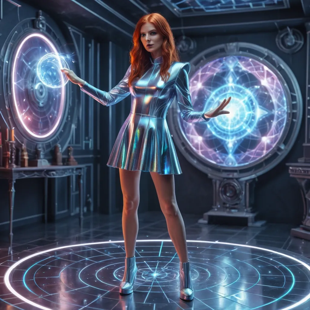 masterpiece photorealistic full lenght a beautiful japanese female with straight shoulder brown hair in her mid twenties in black and red turtleneck sleeveless zipper spandex mini sweaterdress , gentle smile a hand on her hip , standing in a futuristic luminous space station with japanese influence , some flowers and green plants , a bed in the room , science fiction cinematic style ,