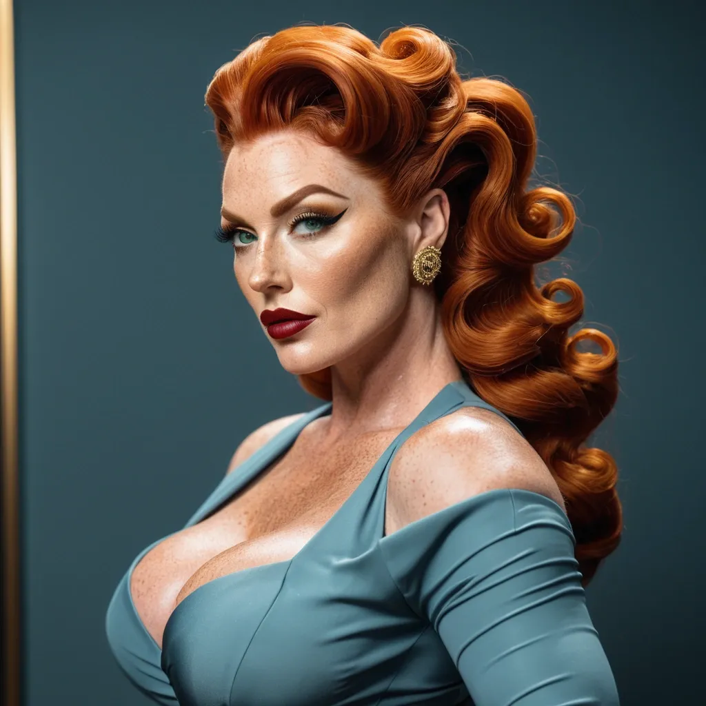 1940s , Generate Gorgeous female boss , bimbo , hourglass body , abnormally massive female bodybuilder , gorgeous , close up , full lips , big booty , redheaded , freckles on face and breast , 1940s designed hair , updo design hair , baby hair curls sides-burns , feminine silhouette , too big breast , big booty , sexy thighs abs , silhouette , up close , flexing biceps , beautiful green eyes , legs are iconic and defining physical feature , both visually and in terms of combat ability.wearing an outfit that is a striking blend of elegance , power , and femininity , designed to command attention in any room. The suit is tailored to perfection , hugging the wearer’s curves with precision while emphasizing a structured silhouette. The fabric itself is a refined grey tweed patterned with subtle white grid lines , giving the suit a texture that feels both sophisticated and modern. The blazer features broad blue lapels and gold button accents , adding a luxurious touch that elevates the look beyond typical business attire. The matching high-waisted trousers elongate the frame , further enhancing the poised and commanding effect of the ensemble.The styling choices amplify the boldness of the suit. The inner blouse is a silky , greybutton-down shirt that complements the tweed’s tone while introducing a softer , feminine balance to the sharp tailoring of the jacket. The blouse peeks out neatly from under the blazer , maintaining elegance without drawing focus away from the suit’s commanding cut. Accessories are kept minimal yet intentional: a delicate layered gold necklace and hoop earrings that add glimmers of light and luxury without overpowering the outfit. The choice of voluminous , honey-brown braids cascading down her shoulders frames the face with both confidence and glamour , completing the commanding visual.Altogether , this look communicates a blend of authority and allure. It is business-ready yet fashion-forward , balancing corporate structure with vibrant femininity. The color palette blue , grey and gold avoids being overly delicate , instead embracing the richness of texture , structure , and presence. This is the kind of ensemble that speaks to ambition , sophistication , and personal style—ideal for someone who thrives in positions of influence but insists on expressing her individuality with bold elegance. It’s not just clothing—it’s a statement of power wrapped in grace. Freckles , Light reflecting green eyes , short fingnernails , massive breast , enormous butt , powerful hourglass silhouette ,