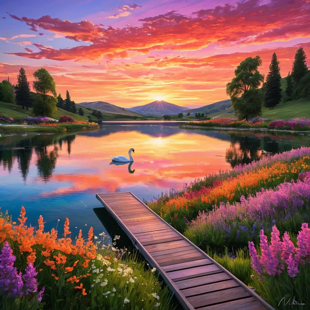 Create a serene landscape at sunset , featuring rolling hills covered in wildflowers , with a crystal-clear lake reflecting the vibrant colors of the sky. Include a small wooden dock extending into the lake and a lone swan gliding across the water. The style should be a blend of impressionism and realism , emphasizing the warm hues of orange , pink , and purple in the sky , contrasted with the lush greens and vivid pops of color from the flowers. ,