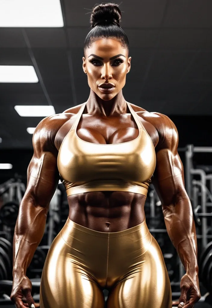 The woman id abnormally massive , enormous breast , enormous butt , in the image is a dark-skinned African-American with an extraordinarily muscular and sculpted physique , powerful hourglass body , too big breast , big booty , showcasing the results of intense bodybuilding training. It's a sleek , closely cropped buzz cut dyed a rich brown , styled with a subtle fade and a glossy finish for a bold , futuristic edge. Her skin gleams with a polished sheen , likely from oil or lighting effects that accentuate the definition of her deltoids , biceps , trapezius , and pectoral muscles , which are prominently displayed in a metallic gold sports bra with geometric cutouts. The top struggles to contain her enhanced chest , blending hyper-femininity with raw power in a way that is both imposing and glamorous. Her arms rest confidently , one hand on her hip , emphasizing vascularity and separation in her forearms and shoulders , marking her as a competitor-level female bodybuilder.Her hairstyle is a bold statement: long , thick dreadlocks partially pulled into a high , voluminous topknot , with the remaining locks cascading down one side , framing her face and adding dramatic height. The braids are meticulously styled , reflecting discipline that mirrors her physical regimen. She wears large , ornate gold hoop earrings and a matching statement necklace with dangling medallions , infusing regal opulence into her athletic presentation. Her makeup is fierce—sharp contouring , glossy lips , and dramatic eyeliner—projecting strength and unapologetic femininity against a minimalist white background that keeps all focus on her presence.This image embodies the fusion of strength , beauty , and cultural pride often celebrated in Black female bodybuilding and fitness modeling. The golden attire evokes themes of triumph and divinity , positioning her as a modern warrior goddess. Such portraits are common among professional athletes in the IFBB or NPC circuits , where women push anatomical boundaries while embracing hyper-feminine aesthetics. Her expression is intense yet composed , radiating confidence and authority—qualities earned through years of dedication in a sport that demands both physical extremity and big beautiful light reflecting hazel eyed , pointy face , powerful curves mental resilience. She’s wearing a fitted white halter modest crop top that shows off her shoulders and midriff. Paired with high-waisted beige pants , the look is simple , clean , and stylish with a warm , casual-chic vibe. Stacked , huge butt , big bust , big round butt , light hazel eyes Enormous breast , enormous butt , big juicy booty ,