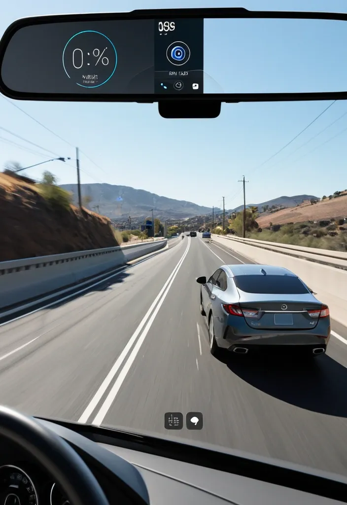 A sleek ROVE R2 Dual Dash Cam (front and rear lenses visible) , shown mounted on a car windshield with a crisp road scene in the background. The road view is split diagonally—day side shows a clear sunny highway , night side shows a city street with glowing headlights—symbolizing 24/7 protection. Subtle icons for Wi-Fi , GPS , and Parking Mode are in a clean , modern overlay. ,