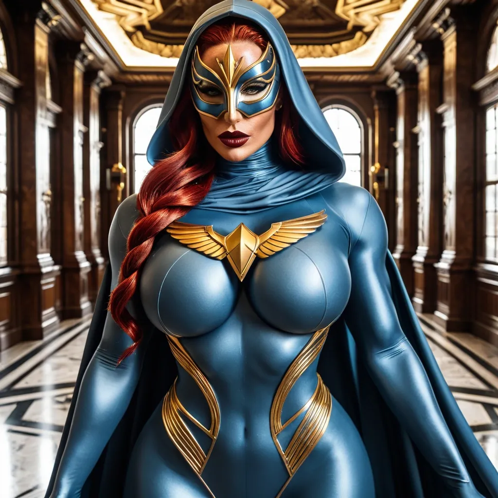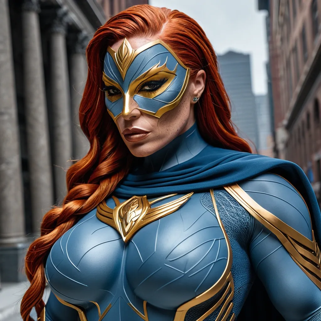 Generate Gorgeous female boss , bimbo , Japanese woman , , hourglass body , abnormally massive female bodybuilder , gorgeous , close up , full lips , big booty , red hair , bob-cut , short hair , feminine silhouette , too big breast , big booty , sexy thighs abs , silhouette , up close , flexing biceps , beautiful brown eyes , legs are iconic and defining physical feature , both visually and in terms of combat ability.wearing an outfit that is a striking blend of elegance , power , and femininity , designed to command attention in any room. The suit is tailored to perfection , hugging the wearer’s curves with precision while emphasizing a structured silhouette. The fabric itself is a refined grey tweed patterned with subtle white grid lines , giving the suit a texture that feels both sophisticated and modern. The blazer features broad blue lapels and gold button accents , adding a luxurious touch that elevates the look beyond typical business attire. The matching high-waisted trousers elongate the frame , further enhancing the poised and commanding effect of the ensemble.The styling choices amplify the boldness of the suit. The inner blouse is a silky , greybutton-down shirt that complements the tweed’s tone while introducing a softer , feminine balance to the sharp tailoring of the jacket. The blouse peeks out neatly from under the blazer , maintaining elegance without drawing focus away from the suit’s commanding cut. Accessories are kept minimal yet intentional: a delicate layered gold necklace and hoop earrings that add glimmers of light and luxury without overpowering the outfit. The choice of voluminous , honey-brown braids cascading down her shoulders frames the face with both confidence and glamour , completing the commanding visual.Altogether , this look communicates a blend of authority and allure. It is business-ready yet fashion-forward , balancing corporate structure with vibrant femininity. The color palette blue , grey and gold avoids being overly delicate , instead embracing the richness of texture , structure , and presence. This is the kind of ensemble that speaks to ambition , sophistication , and personal style—ideal for someone who thrives in positions of influence but insists on expressing her individuality with bold elegance. It’s not just clothing—it’s a statement of power wrapped in grace. In luxury living legs that could crush a watermelon , skirt high boots are a bold and striking statement piece , crafted in glossy black patent leather that gives them a sleek , polished finish. Rising to just below the knee , the boots feature three adjustable buckle straps along the shaft , adding both edge and detail to their design. The towering stiletto heel , paired with a thick platform sole , creates an ultra-dramatic silhouette that elongates the leg and exudes power and confidence. With their combination of shine , height , and structure , these boots perfectly balance fierce femininity with high-fashion allure. High cheekbones , prominent jawline , gorgeous big enormous breast , enormous butt , up close , She is wearing a form-fitting gray blazer with black lapels over a low-cut white top , paired with a matching tight copper colored pencil skirt , sheer black stockings , and accessorized a necklace police badge , and earrings. ,
