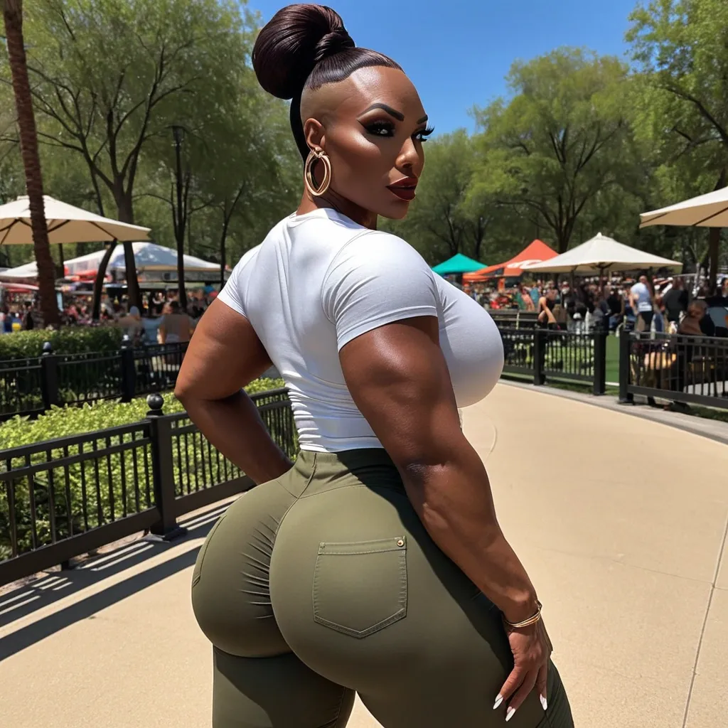Generate Gorgeous female boss , Japanese woman , bimbo , hourglass body , abnormally massive female bodybuilder , gorgeous , close up , full lips , big booty , red hair , bob cut hair style , feminine silhouette , too big breast , big booty , sexy thighs abs , silhouette , up close , flexing biceps , beautiful brown eyes , legs are iconic and defining physical feature , both visually and in terms of combat ability.wearing an outfit that is a striking blend of elegance , power , and femininity , designed to command attention in any room. The suit is tailored to perfection , hugging the wearer’s curves with precision while emphasizing a structured silhouette. The fabric itself is a refined grey tweed patterned with subtle white grid lines , giving the suit a texture that feels both sophisticated and modern. The blazer features broad blue lapels and gold button accents , adding a luxurious touch that elevates the look beyond typical business attire. The matching high-waisted trousers elongate the frame , further enhancing the poised and commanding effect of the ensemble.The styling choices amplify the boldness of the suit. The inner blouse is a silky , greybutton-down shirt that complements the tweed’s tone while introducing a softer , feminine balance to the sharp tailoring of the jacket. The blouse peeks out neatly from under the blazer , maintaining elegance without drawing focus away from the suit’s commanding cut. Accessories are kept minimal yet intentional: a delicate layered gold necklace and hoop earrings that add glimmers of light and luxury without overpowering the outfit. The choice of voluminous , honey-brown braids cascading down her shoulders frames the face with both confidence and glamour , completing the commanding visual.Altogether , this look communicates a blend of authority and allure. It is business-ready yet fashion-forward , balancing corporate structure with vibrant femininity. The color palette blue , grey and gold avoids being overly delicate , instead embracing the richness of texture , structure , and presence. This is the kind of ensemble that speaks to ambition , sophistication , and personal style—ideal for someone who thrives in positions of influence but insists on expressing her individuality with bold elegance. It’s not just clothing—it’s a statement of power wrapped in grace. In luxury living legs that could crush a watermelon , skirt high boots are a bold and striking statement piece , crafted in glossy black patent leather that gives them a sleek , polished finish. Rising to just below the knee , the boots feature three adjustable buckle straps along the shaft , adding both edge and detail to their design. The towering stiletto heel , paired with a thick platform sole , creates an ultra-dramatic silhouette that elongates the leg and exudes power and confidence. With their combination of shine , height , and structure , these boots perfectly balance fierce femininity with high-fashion allure. Massive breast , massive cleavage , Up close shot , gray , black , and sky blue v-neck t-shirt , silver necklace ,