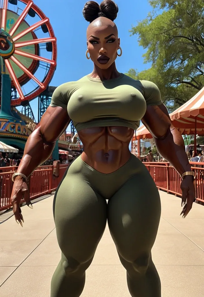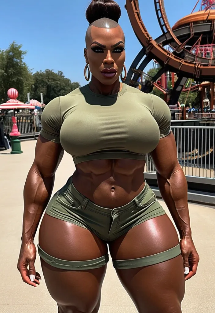 Amazon giant Maid woman BBW musclée , heavy weight bodybuildeuse géante et plantureuse with giant chest , imposante dame massive , Vanessa Williams face , avec de gros seins , énormes biceps musclés , in white mini apron tablier sexy , exposant les seins , bras musclés exposés , dominante , jambes massives exposées , agressive , ,