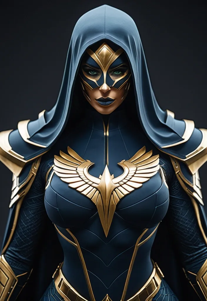 Generate Gorgeous female boss , latina , bimbo , hourglass body , abnormally massive female bodybuilder , gorgeous , close up , full lips , big booty , black hair , freckles on face and breast , black stylish hair , feminine silhouette , too big breast , big booty , sexy thighs abs , silhouette , up close , flexing biceps , beautiful green eyes , legs are iconic and defining physical feature , both visually and in terms of combat ability.wearing an outfit that is a striking blend of elegance , power , and femininity , designed to command attention in any room. The suit is tailored to perfection , hugging the wearer’s curves with precision while emphasizing a structured silhouette. The fabric itself is a refined grey tweed patterned with subtle white grid lines , giving the suit a texture that feels both sophisticated and modern. The blazer features broad blue lapels and gold button accents , adding a luxurious touch that elevates the look beyond typical business attire. The matching high-waisted trousers elongate the frame , further enhancing the poised and commanding effect of the ensemble.The styling choices amplify the boldness of the suit. The inner blouse is a silky , greybutton-down shirt that complements the tweed’s tone while introducing a softer , feminine balance to the sharp tailoring of the jacket. The blouse peeks out neatly from under the blazer , maintaining elegance without drawing focus away from the suit’s commanding cut. Accessories are kept minimal yet intentional: a delicate layered gold necklace and hoop earrings that add glimmers of light and luxury without overpowering the outfit. The choice of voluminous , honey-brown braids cascading down her shoulders frames the face with both confidence and glamour , completing the commanding visual.Altogether , this look communicates a blend of authority and allure. It is business-ready yet fashion-forward , balancing corporate structure with vibrant femininity. The color palette blue , grey and gold avoids being overly delicate , instead embracing the richness of texture , structure , and presence. This is the kind of ensemble that speaks to ambition , sophistication , and personal style—ideal for someone who thrives in positions of influence but insists on expressing her individuality with bold elegance. It’s not just clothing—it’s a statement of power wrapped in grace. In luxury living legs that could crush a watermelon , skirt high boots are a bold and striking statement piece , crafted in glossy black patent leather that gives them a sleek , polished finish. Rising to just below the knee , the boots feature three adjustable buckle straps along the shaft , adding both edge and detail to their design. The towering stiletto heel , paired with a thick platform sole , creates an ultra-dramatic silhouette that elongates the leg and exudes power and confidence. With their combination of shine , height , and structure , these boots perfectly balance fierce femininity with high-fashion allure. High cheekbones , prominent jawline , gorgeous big green eyes , The suit is tailored to perfection , hugging the wearer’s curves with precision while emphasizing a structured silhouette. The fabric itself is a refined hood is a sleek , shadowed piece of her attire that falls close around her head and face , designed to enhance her aura of mystery and command. It is constructed from a matte black material that absorbs the light rather than reflecting it , giving her an ominous , almost spectral presence. The hood frames her face sharply and extends back into her cape , making her silhouette formidable and cohesive in its dark elegance. Its cut and fit are tailored to stay close to her head , preventing it from obstructing her vision while still cloaking her in an air of secrecy.Her mask is sharp , angular , and striking in its design. Black in color and sculpted to fit tightly against her face , it covers the area around her eyes with precision. Its edges sweep into bold curves that sharpen her gaze , emphasizing her piercing eyes and amplifying the intensity of her expression. The mask isn’t just a disguise—it acts as a symbol of her commitment , projecting authority and determination. With its seamless integration into her look , the mask gives her a sense of duality: a woman hidden yet revealed , a protector whose eyes burn with resolve.The superhero top is a masterpiece of tactical artistry and symbolism. Made from high-grade , form-fitted navy blue material that molds seamlessly to her muscular frame , it balances power with elegance. Across her chest spreads the golden emblem of a soaring eagle—wings outstretched , poised in eternal flight—representing her vow to uphold justice and truth. Gold lines accentuate her physique , converging in a V-shaped pattern that not only reinforces her strength but also adds a regal , almost ceremonial presence. This design makes her top both armor and declaration , a visual oath in itself. embracing the richness of texture , structure , and presence. This is the kind of ensemble that speaks to ambition , sophistication , and personal style—ideal for someone who thrives in positions of influence but insists on expressing her individuality with bold elegance. It’s not just clothing—it’s a statement of power wrapped in grace. Half mask , exposing hair , exposing mouth golden eagle emblem on chest. Cape ,