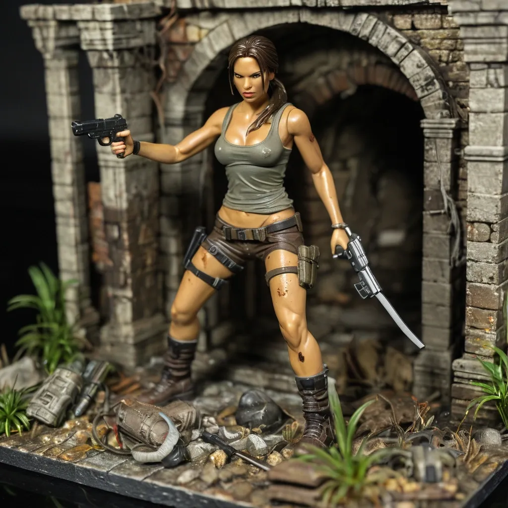 A sexy action figure of Sherry Birkin Resident Evil 6. She is in her hospital gown , this is a tabard style lose fitting item , for a medical procedure not a lab coat. It is lightly tied at the sides , has a plunge neck and hip length. She has no other clothes.she holds a pair of electrick stun batons. She Stands over a defeated soldier , he is in black and wears a mothern military gas mask.. on a diorama base ,