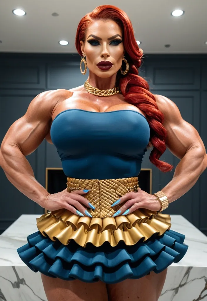 Generate Gorgeous female boss , bimbo , hourglass body , abnormally massive female bodybuilder , gorgeous , close up , full lips , big booty , redheaded , freckles on face and breast , braided design hair , feminine silhouette , too big breast , big booty , sexy thighs abs , silhouette , up close , flexing biceps , beautiful green eyes , legs are iconic and defining physical feature , both visually and in terms of combat ability.wearing an outfit that is a striking blend of elegance , power , and femininity , designed to command attention in any room. The suit is tailored to perfection , hugging the wearer’s curves with precision while emphasizing a structured silhouette. The fabric itself is a refined grey tweed patterned with subtle white grid lines , giving the suit a texture that feels both sophisticated and modern. The blazer features broad blue lapels and gold button accents , adding a luxurious touch that elevates the look beyond typical business attire. The matching high-waisted trousers elongate the frame , further enhancing the poised and commanding effect of the ensemble.The styling choices amplify the boldness of the suit. The inner blouse is a silky , greybutton-down shirt that complements the tweed’s tone while introducing a softer , feminine balance to the sharp tailoring of the jacket. The blouse peeks out neatly from under the blazer , maintaining elegance without drawing focus away from the suit’s commanding cut. Accessories are kept minimal yet intentional: a delicate layered gold necklace and hoop earrings that add glimmers of light and luxury without overpowering the outfit. The choice of voluminous , honey-brown braids cascading down her shoulders frames the face with both confidence and glamour , completing the commanding visual.Altogether , this look communicates a blend of authority and allure. It is business-ready yet fashion-forward , balancing corporate structure with vibrant femininity. The color palette blue , grey and gold avoids being overly delicate , instead embracing the richness of texture , structure , and presence. This is the kind of ensemble that speaks to ambition , sophistication , and personal style—ideal for someone who thrives in positions of influence but insists on expressing her individuality with bold elegance. It’s not just clothing—it’s a statement of power wrapped in grace. In luxury living legs that could crush a watermelon , skirt , stacked hourglass silhouette , up close shot ,