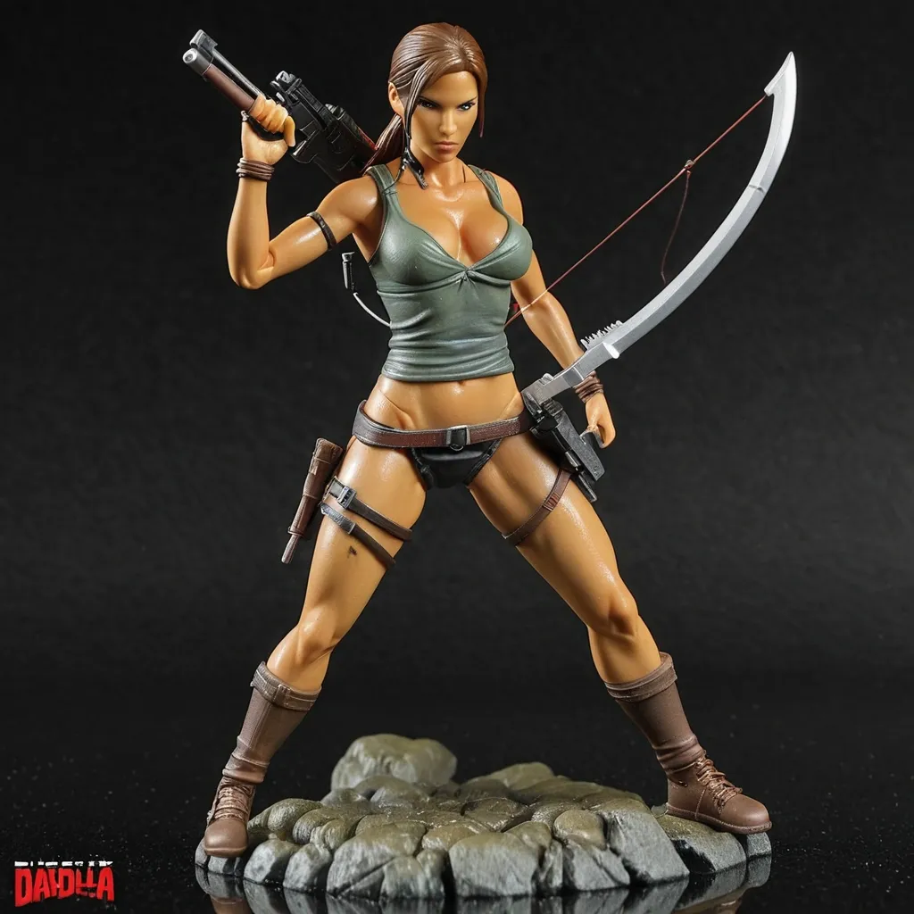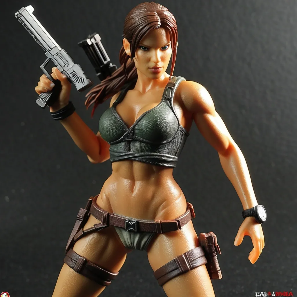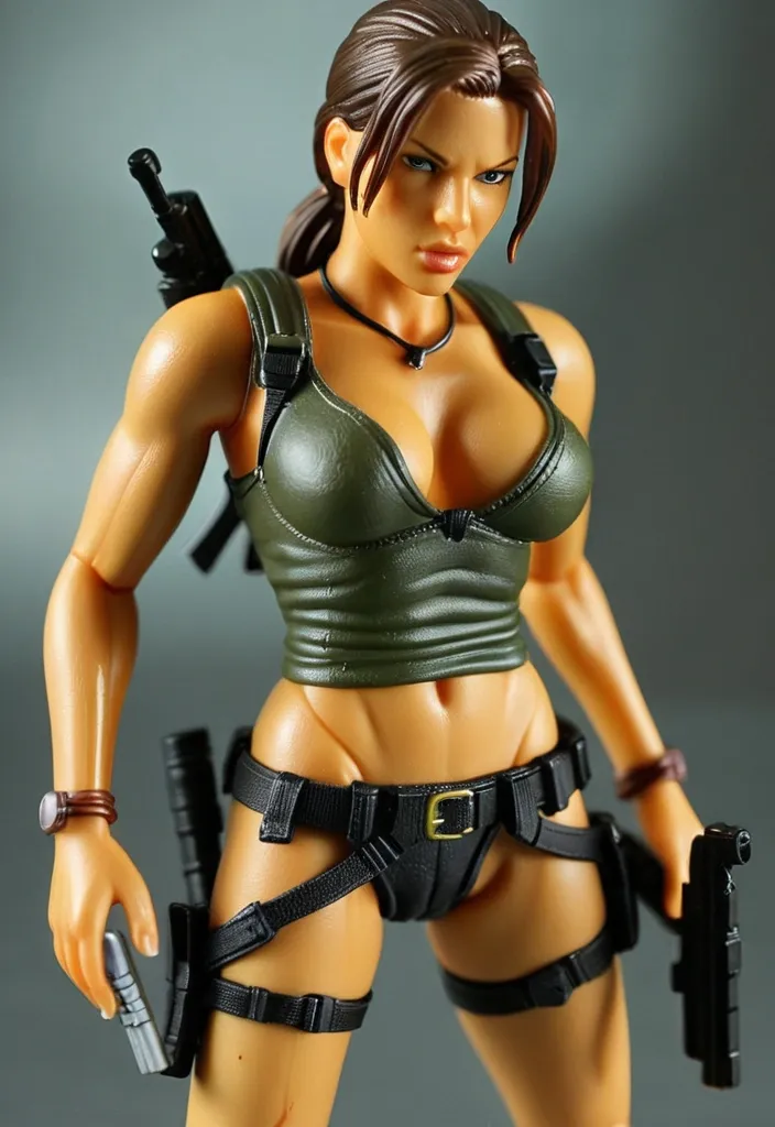 A sexy action figure of Sherry Birkin Resident Evil 6. She is in her hospital gown , this is a tabard style lose fitting item , for a medical procedure not a lab coat. It is lightly tied at each side , it has a plunge neck and hip length. She has no other clothes.she holds a pair of electrick stun batons. She Stands over a defeated soldier , he is in black and wears a mothern military gas mask.. on a diorama base ,