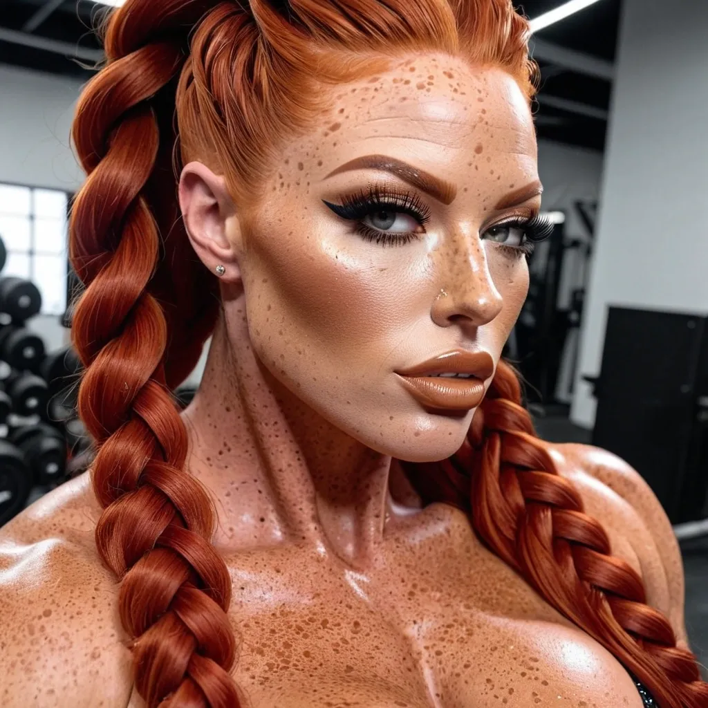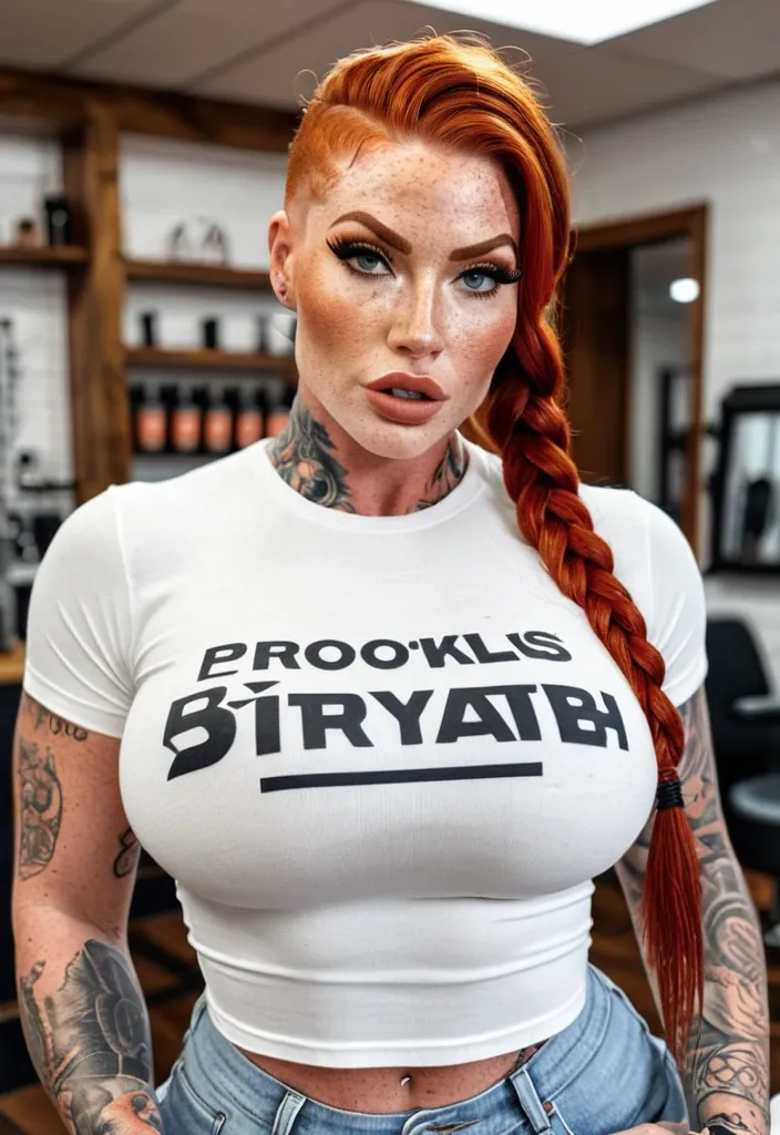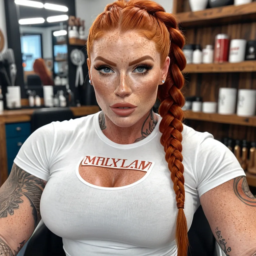 Generate Gorgeous female boss , bimbo , hourglass body , abnormally massive female bodybuilder , gorgeous , close up , full lips , big booty , redheaded , freckles on face and breast , braided design hair , feminine silhouette , too big breast , big booty , sexy thighs abs , silhouette , up close , flexing biceps , beautiful green eyes , legs are iconic and defining physical feature , both visually and in terms of combat ability.wearing an outfit that is a striking blend of elegance , power , and femininity , designed to command attention in any room. The suit is tailored to perfection , hugging the wearer’s curves with precision while emphasizing a structured silhouette. The fabric itself is a refined grey tweed patterned with subtle white grid lines , giving the suit a texture that feels both sophisticated and modern. The blazer features broad blue lapels and gold button accents , adding a luxurious touch that elevates the look beyond typical business attire. The matching high-waisted trousers elongate the frame , further enhancing the poised and commanding effect of the ensemble.The styling choices amplify the boldness of the suit. The inner blouse is a silky , greybutton-down shirt that complements the tweed’s tone while introducing a softer , feminine balance to the sharp tailoring of the jacket. The blouse peeks out neatly from under the blazer , maintaining elegance without drawing focus away from the suit’s commanding cut. Accessories are kept minimal yet intentional: a delicate layered gold necklace and hoop earrings that add glimmers of light and luxury without overpowering the outfit. The choice of voluminous , honey-brown braids cascading down her shoulders frames the face with both confidence and glamour , completing the commanding visual.Altogether , this look communicates a blend of authority and allure. It is business-ready yet fashion-forward , balancing corporate structure with vibrant femininity. The color palette blue , grey and gold avoids being overly delicate , instead embracing the richness of texture , structure , and presence. This is the kind of ensemble that speaks to ambition , sophistication , and personal style—ideal for someone who thrives in positions of influence but insists on expressing her individuality with bold elegance. It’s not just clothing—it’s a statement of power wrapped in grace. In luxury living legs that could crush a watermelon , skirt high boots are a bold and striking statement piece , crafted in glossy black patent leather that gives them a sleek , polished finish. Rising to just below the knee , the boots feature three adjustable buckle straps along the shaft , adding both edge and detail to their design. The towering stiletto heel , paired with a thick platform sole , creates an ultra-dramatic silhouette that elongates the leg and exudes power and confidence. With their combination of shine , height , and structure , these boots perfectly balance fierce femininity with high-fashion allure , white t-shirt , and blue jean shorts in barbershop , freckles , ginger hair ,