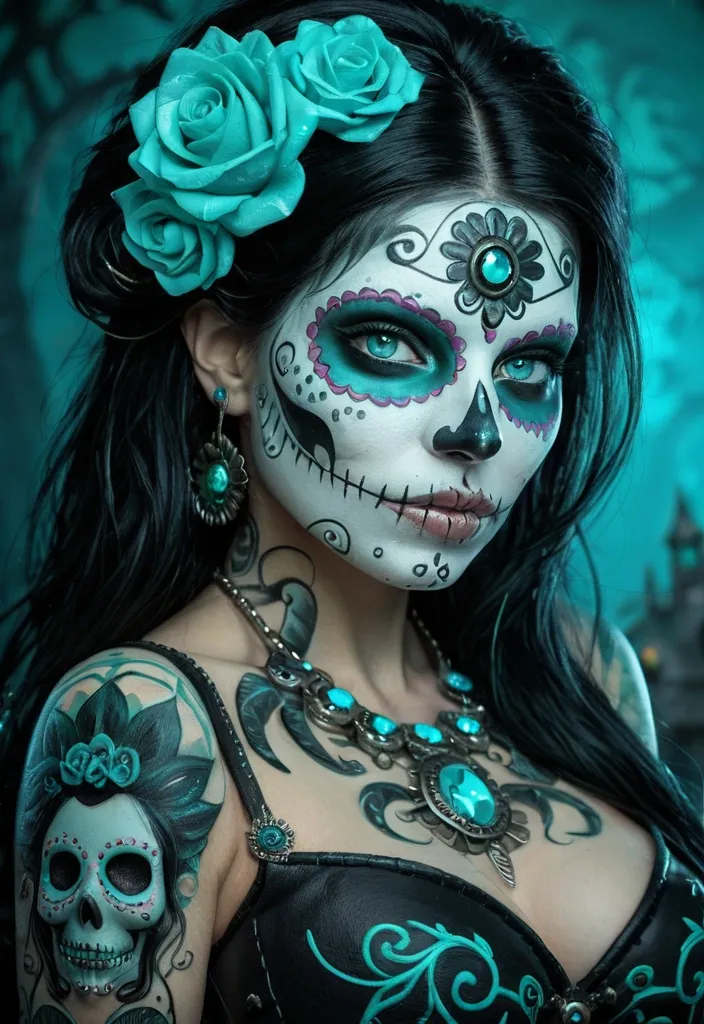 a chaos of Carnage with a photo-realistic face resembling an cult skull , eerie light casting deep shadows across her face , her eyes wide with intensity , sporting dazzling diamond grills for teeth. Starting from her head transitions into a tornado that both shapes and fills the structure of the head. Style: Celestial , ethereal , abstract , digital art smoking: Dramatic backlighting , bright glowing particles , contrasting dark background Composition: dynamic diagonal composition , upward gaze Details: a semi-transparent quality akin to black fog , streaking white light trails , sense of movement and wonder , magical atmosphere Quality: High detail , 4K , Masterpiece , Arabian black desert and in front a silhouette of Ancient Arabs migrate with their camels and belongings , and in front of them is a caravan leader ,