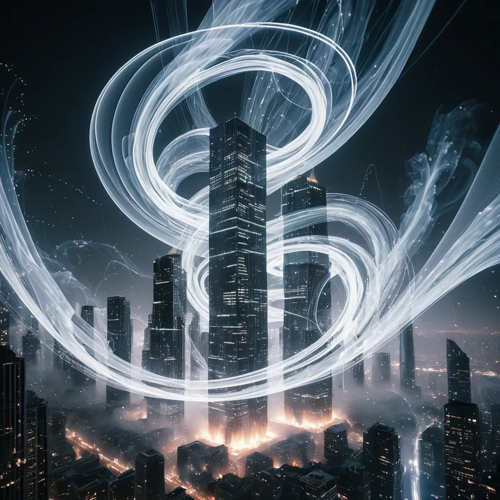 A Drone made of soft , flowing smoke , Wisps curl gracefully to create a swirling vortex of vertically skyscrapers. Style: Celestial , ethereal , abstract , digital art Lighting: Dramatic backlighting , bright glowing particles , contrasting night background Composition: dynamic diagonal , composition , upward gaze Details: Swirling white waves and smoke , streaking white light trails , sense of movement and wonder , magical atmosphere Quality: High detail , 4K , Masterpiece , Rendered in Octane. ,
