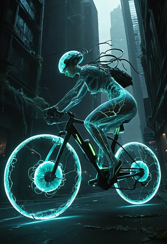 A fusion of Biopunk and Dark Fantasy. Deep within an alien city road filled with glowing plants and skyscraper , the trainer and her 'mount' are a single symbiotic organism. Her lower body has completely fused with the bio-Bike , which is composed of translucent mycelium and glowing plant fibers , forming a seamless , streamlined being. This "Bike" has no eyes; it navigates entirely through the trainer's vision and will. The image captures the moment they evade a venomous vine striking from above: the bio-Bike erupts with a powerful bioluminescence , its body becoming almost transparent and revealing the network of energy within , while pivoting at a physically impossible angle on its hind wheels. ,