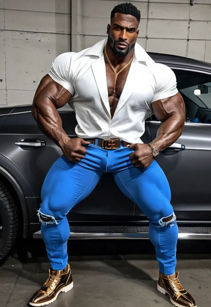 Generate ruggedly handsome dark-skinned African-American man abnormally massive male bodybuilder , , close up , full lips , big booty , black trimmed coarse hair , big , muscular man , brown strikingly intense and alluring eyes , up close , flexing biceps , beautiful brown eyes , legs are iconic and defining physical feature , both visually and in terms of combat ability.wearing an outfit that is a striking blend of elegance , power , and femininity , designed to command attention in any room. The suit is tailored to perfection , hugging the wearer’s curves with precision while emphasizing a structured silhouette. The fabric itself is a refined grey tweed patterned with subtle white grid lines , giving the suit a texture that feels both sophisticated and modern. The blazer features broad blue lapels and gold button accents , adding a luxurious touch that elevates the look beyond typical business attire. The matching high-waisted trousers elongate the frame , further enhancing the poised and commanding effect of the ensemble.The styling choices amplify the boldness of the suit. The inner shirt is a silky , greybutton-down shirt that complements the tweed’s tone while introducing a masculine balance to the sharp tailoring of the jacket. The shirt peeks out neatly from under the blazer , maintaining elegance without drawing focus away from the suit’s commanding cut. Accessories are kept minimal yet intentional: a delicate layered gold necklace ad alpha leader of light and luxury without overpowering the outfit completing the commanding visual.Altogether , this look communicates a blend of authority and allure. It is business-ready yet fashion-forward , balancing corporate structure with vibrant femininity. The color palette blue , grey and gold avoids being overly delicate , instead embracing the richness of texture , structure , and presence. This is the kind of ensemble that speaks to ambition , sophistication , and personal style—ideal for someone who thrives in positions of influence but insists on expressing her individuality with bold elegance. It’s not just clothing—it’s a statement of power wrapped in grace. In luxury living legs that could crush a watermelon , skirt high boots are a bold and striking statement piece , crafted in glossy black patent leather that gives them a sleek , polished finish. Rising to just below the knee , the boots feature three adjustable buckle straps along the shaft , adding both edge and detail to their design. The towering stiletto heel , paired with a thick platform sole , creates an ultra-dramatic silhouette that elongates the leg and exudes power and confidence. With their combination of shine , height , and structure , these boots perfectly balance fierce femininity with high-fashion allure , blue sports coat and white V-neck T-shirt , blue jeans , and pants , and Stacey Adams , like shoes and a gold chain ,