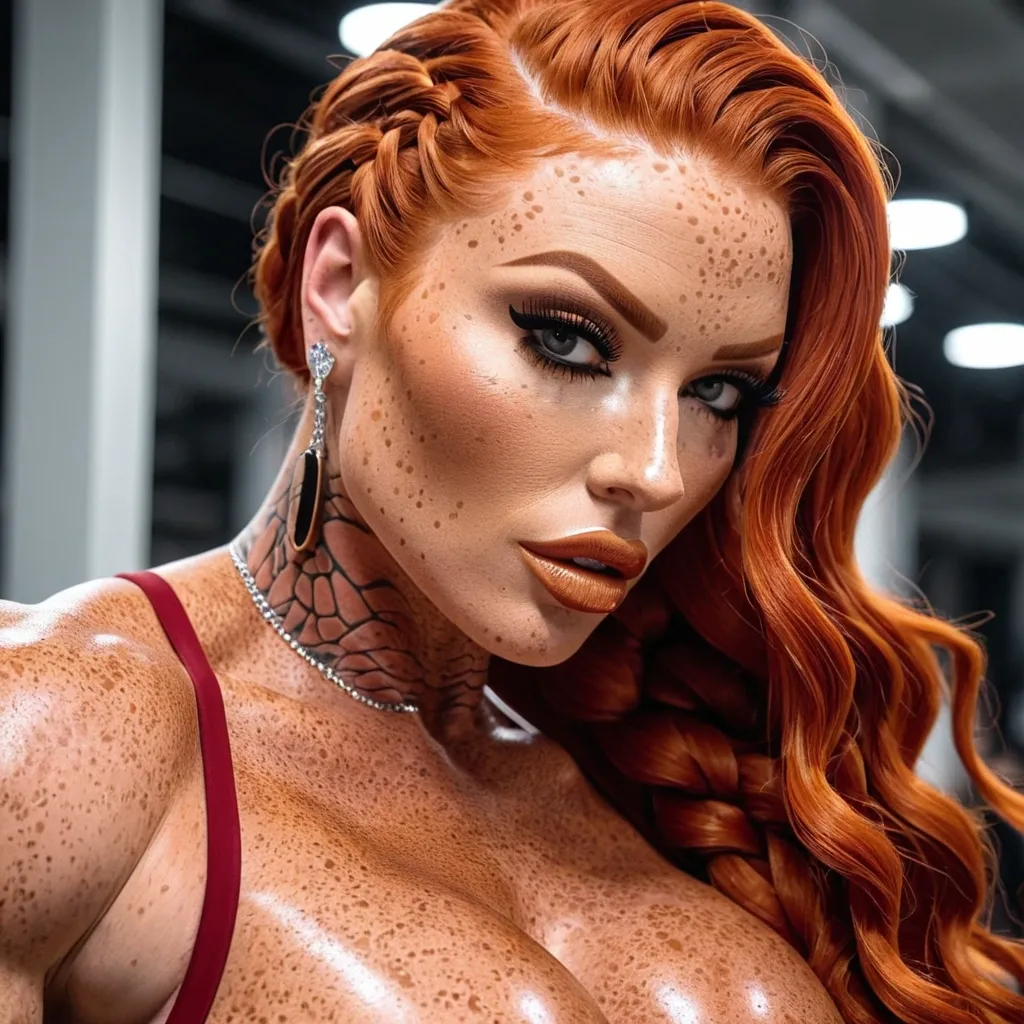 Generate Gorgeous female boss , bimbo , hourglass body , abnormally massive female bodybuilder , gorgeous , close up , full lips , big booty , redheaded , freckles on face and breast , braided design hair , feminine silhouette , too big breast , big booty , sexy thighs abs , silhouette , up close , flexing biceps , beautiful green eyes , legs are iconic and defining physical feature , both visually and in terms of combat ability.wearing an outfit that is a striking blend of elegance , power , and femininity , designed to command attention in any room. The suit is tailored to perfection , hugging the wearer’s curves with precision while emphasizing a structured silhouette. The fabric itself is a refined grey tweed patterned with subtle white grid lines , giving the suit a texture that feels both sophisticated and modern. The blazer features broad blue lapels and gold button accents , adding a luxurious touch that elevates the look beyond typical business attire. The matching high-waisted trousers elongate the frame , further enhancing the poised and commanding effect of the ensemble.The styling choices amplify the boldness of the suit. The inner blouse is a silky , greybutton-down shirt that complements the tweed’s tone while introducing a softer , feminine balance to the sharp tailoring of the jacket. The blouse peeks out neatly from under the blazer , maintaining elegance without drawing focus away from the suit’s commanding cut. Accessories are kept minimal yet intentional: a delicate layered gold necklace and hoop earrings that add glimmers of light and luxury without overpowering the outfit. The choice of voluminous , honey-brown braids cascading down her shoulders frames the face with both confidence and glamour , completing the commanding visual.Altogether , this look communicates a blend of authority and allure. It is business-ready yet fashion-forward , balancing corporate structure with vibrant femininity. The color palette blue , grey and gold avoids being overly delicate , instead embracing the richness of texture , structure , and presence. This is the kind of ensemble that speaks to ambition , sophistication , and personal style—ideal for someone who thrives in positions of influence but insists on expressing her individuality with bold elegance. It’s not just clothing—it’s a statement of power wrapped in grace. In luxury living legs that could crush a watermelon , skirt high boots are a bold and striking statement piece , crafted in glossy black patent leather that gives them a sleek , polished finish. Rising to just below the knee , the boots feature three adjustable buckle straps along the shaft , adding both edge and detail to their design. The towering stiletto heel , paired with a thick platform sole , creates an ultra-dramatic silhouette that elongates the leg and exudes power and confidence. With their combination of shine , height , and structure , these boots perfectly balance fierce femininity with high-fashion allure. ,