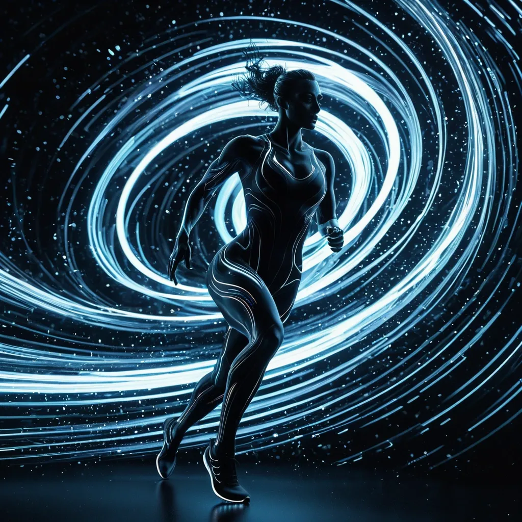A Abstract depicted in an Abstract graphic Interference style , octane renderer , colorfully fine pimples with swirling vortex patterns and dynamic light with motion speed effects. The holographic elements should create a sense of movement and energy with tiny Athlete runner on road , motion speed. Employ a black color palette of sapphire black with iridescent shimmer. Style: Celestial , ethereal , abstract , digital art black Lighting: Dramatic backlighting , bright glowing particles , contrasting dark background Composition: dynamic diagonal , composition , upward gaze Details: Sparkling white waves and smoke , streaking white light trails , sense of movement and wonder , magical atmosphere Quality: High detail , 4K , Masterpiece , Rendered in Octane. ,