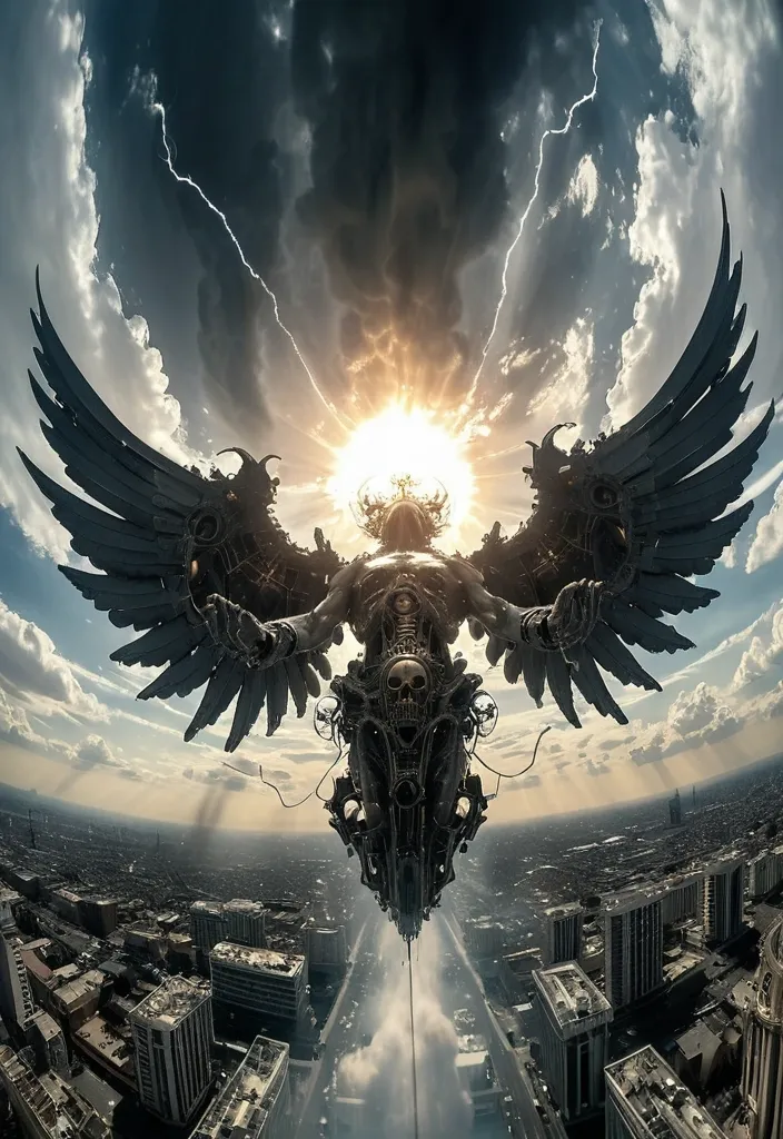 fish eye view , (extremely delicate and gorgeous) , semi-realistic , Dynamic angle , death gigantic angel through clouds , (Mechanical organs) , in sky , clouds , holy light , judgement , Sacred , city , (Mirage of Angel through cloud) , sun , dynamics , (panorama) , fire , Explosion , smoke , Lightning , (dark soul) , (Gigantic dark gothic mechanical death Angel) , ,