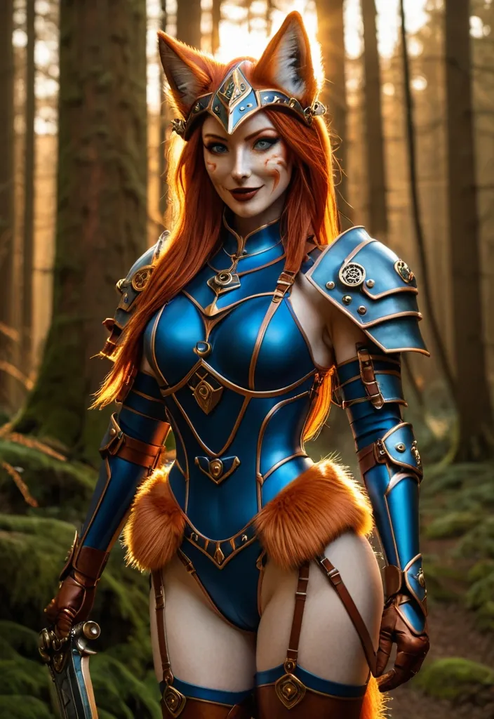 Masterpiece Photorealistic full lenght freckled redhead kitsune 25yo woman wearing a blue sleek armour , form-fitting steampunk swimsuit armour , complete with a lush , flowing fox tail. Her face is distinctly human with expressive , bright eyes and a gentle smile. The scene is set on a beautiful forest with soft , warm lighting , casting a golden hour glow that highlights the textures of her fur and swimsuit armour , she have a steampunk gunblade inher right hand ,