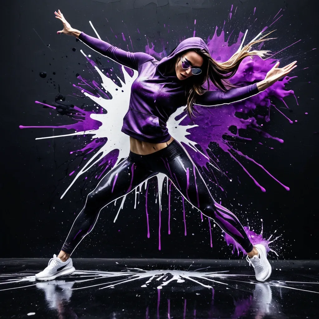 Hyper-realistic 4k photograph , stylized , dynamic artwork depicts a young adult woman mid-leap or dance pose against a split background. The background is vertically divided: the left side is dark , primarily black and deep shades of Purple , while the right side is stark white. The woman is positioned centrally , caught in an explosive burst of color , material , and shatered glasses in same color of the *liquid*. The woman has a slender athletic build , suggesting a dancer. She appears to be in her 20s or early 30s. She has fair complexion , though partially obscured by the dramatic lighting and artistic effects. She is wearing athletic or casual attire , including a purple tank top and fitted black denim trousers. Her outfit is partially obscured by the paint/*liquid* effects. She wears high-top sneakers in a matching Purple color with hint of black She is wearing a hooded sweatshirt , though the hood is up and covers most of her hair , visible around her face and flowing on her upper body. Her expression is focused or intense , looking downward and slightly to her left. The pose is highly energetic and balanced , suggesting a gravity-defying jump or acrobatic move. Her right arm is extended upward and slightly bent at the elbow , hand open. Her left arm is extended to her side , slightly downward. Her legs are bent , with her knees drawn up towards her chest , and her feet are positioned below her , creating a sense of momentum. A major element of the image is the *shattering* or *splatter* effect emanating from and around the figure. On the left , dark side , a massive , vibrant splash of Purple and pastel purple *liquid* or paint explodes outward , creating streaks , drips , and intricate patterns that seem to follow the curve of her body and extend aggressively into the dark background. On the right , white side , the effect is reversed; dark , shattered , ink-like fragments and streaks appear to be pushing away from her and ripping through the white background , suggesting a boundary being broken or a powerful impact. The overall aesthetic combines elements of street art , digital painting , and dynamic photography , focusing on motion , contrast , and color intensity. The lighting is dramatic , highlighting her and the textures of the paint splatters. --ar 9:16 , ,