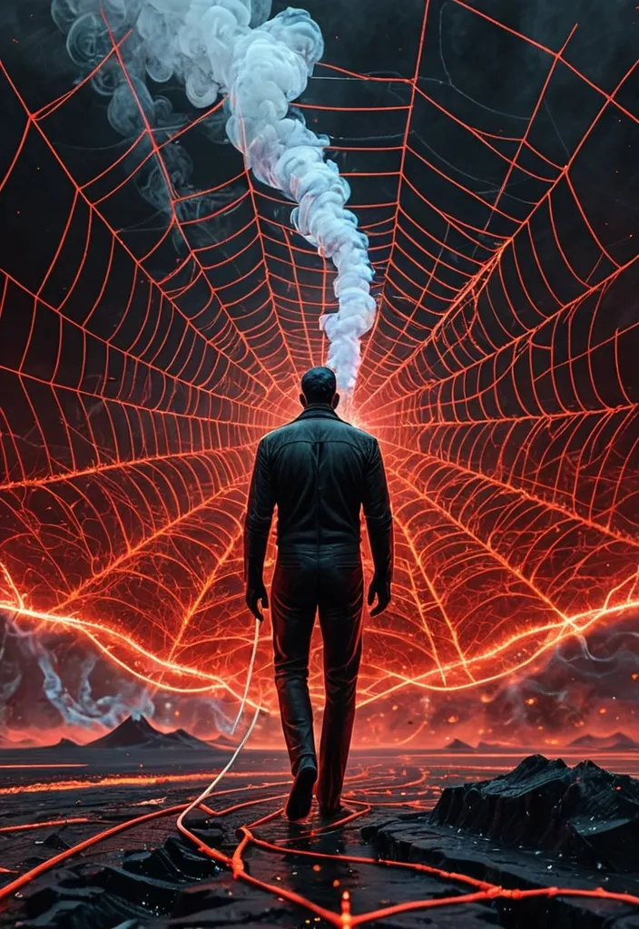 A figure at the edge of an event horizon--the point where smoke bends out from Cigarette hasn't yet been consumed. The figure is small against the scale of the void , but positioned like they walked there deliberately. Not falling. Standing on the edge of long burning giant Cigarette. The red spider-web isn't vortex as all direction. Style: deeply spiritual sci-fi art , reminiscent of digital hyper-realism combined with cosmic impressionism. Focus on intricate detail of particles and smoke flow. ,