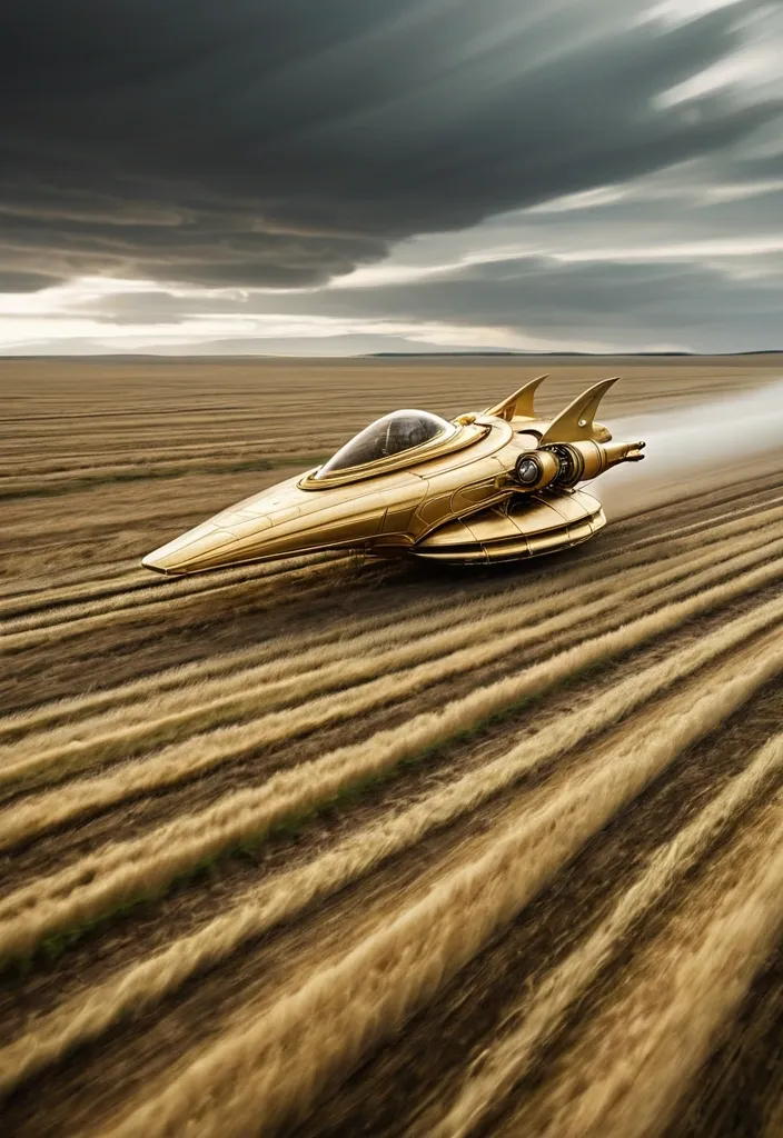 A motion blur photography , long range shoot , mysterious machinery and flying vehicle details. No human presence is visible , a operator wearing a costume , alien sitting in. The spacecraft edge of the craft curves long and wave-like , crafted from golden metallic form emphasize a natural setting with a shimmering , liquid surface , in a surrealistic cloudy dramatic vast expense field , shutter speed 1/15s , dynamic sweeping lines , natural lighting , high-speed movement. ,