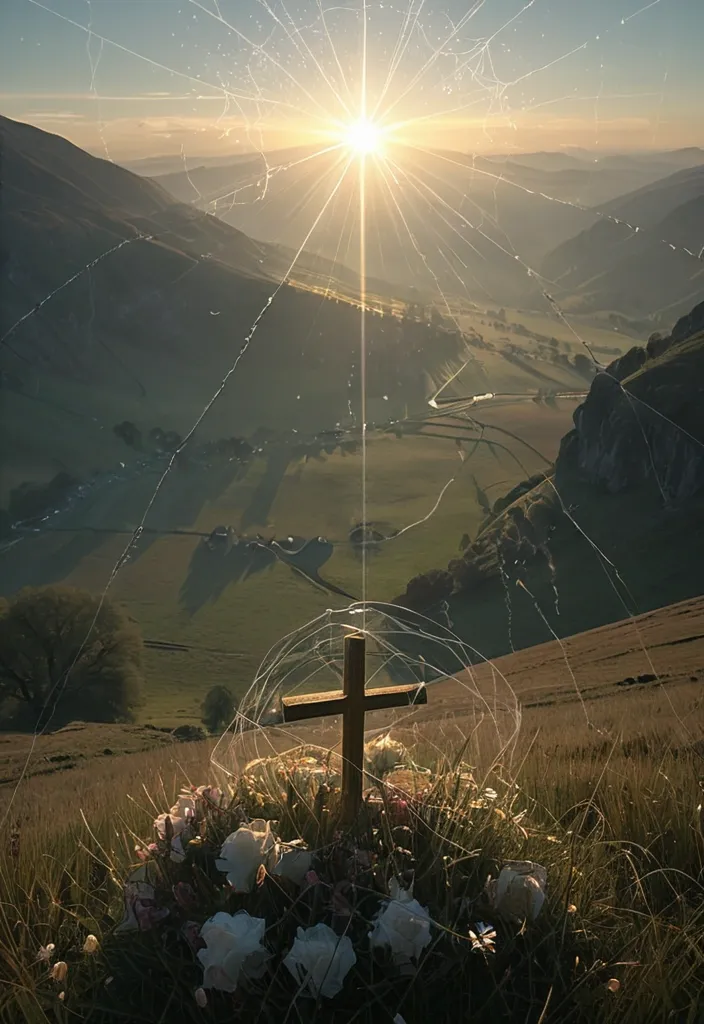 360-degree spherical image of a cozy north-east mountain , beside a cross , a breathtaking sigth over mountain , with the view in the middle point , the cross not so important , nestled in a valley , with soft morning mist gently rolling over the fields. A faint , warm sunlight filters through the haze , illuminating dewdrops on spiderwebs. before the spiderwebs , a cross shining through extremely bright representing the power of god talking to us , reminiscent of a still life by edgar degas , bloom in vibrant hues , their petals gently swaying in the breeze , as if choreographed to the rhythm of a beautiful , cinematic ballet. The air is still and peaceful , with only the distant sound of a gentle stream. Rendered in a soft , impressionistic style with muted colors. ,