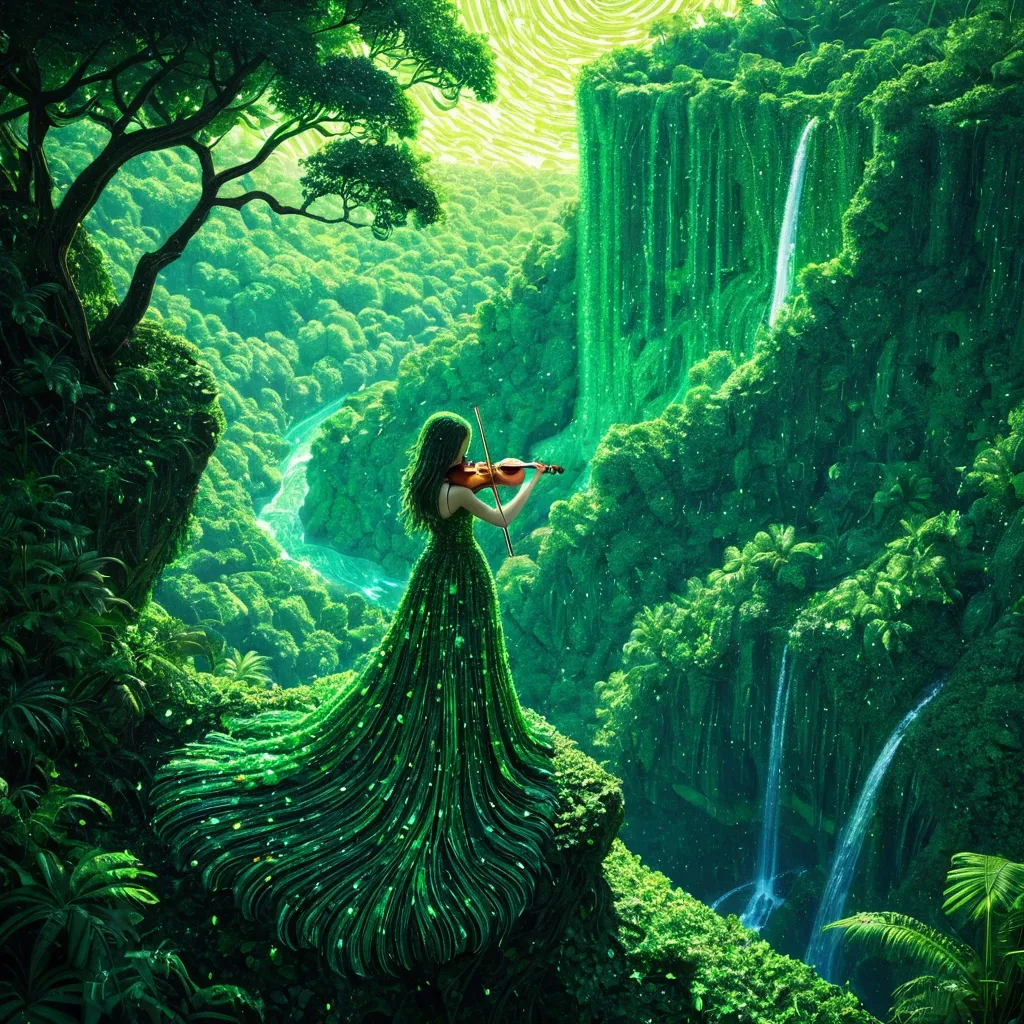 A lone celestial female stands on a cliff edge , she is playing the violin , rendered entirely as a luminous pointillism leaves made of thousands of stripes and leaves in a vibrant green gradient. The gown flows into a dramatic that forms a large , gazing out at a vast , uncharted jungle canopy stretching to the horizon. Below , a hidden waterfall cascades into a crystal-clear river , an immense eye integrated into a rich jungle landscape. The eye's iris is a vivid emerald , reflecting the surrounding greenery , with branches and foliage seamlessly forming its lashes and eyelids. The lush scene conveys a sense of serenity and deep connection with nature. ,