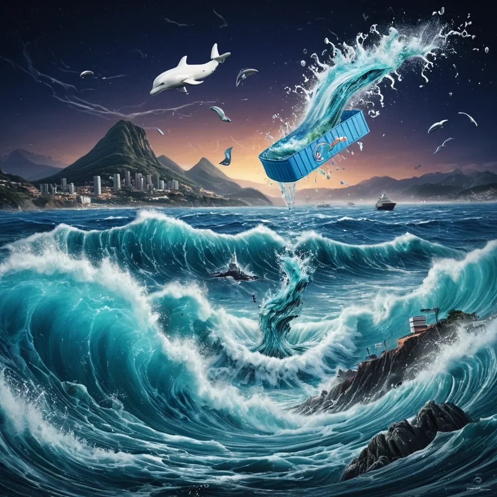 A surreal landscape emerging from Hand Melting from the time spill in air , backdrop of splashing water wave tide , showing mountains , dolphin jumping in ocean with splash water-waves. while iconic container vessel floating on hand , distance ocean with splash water-waves , para-glider fly in the night sky. ,