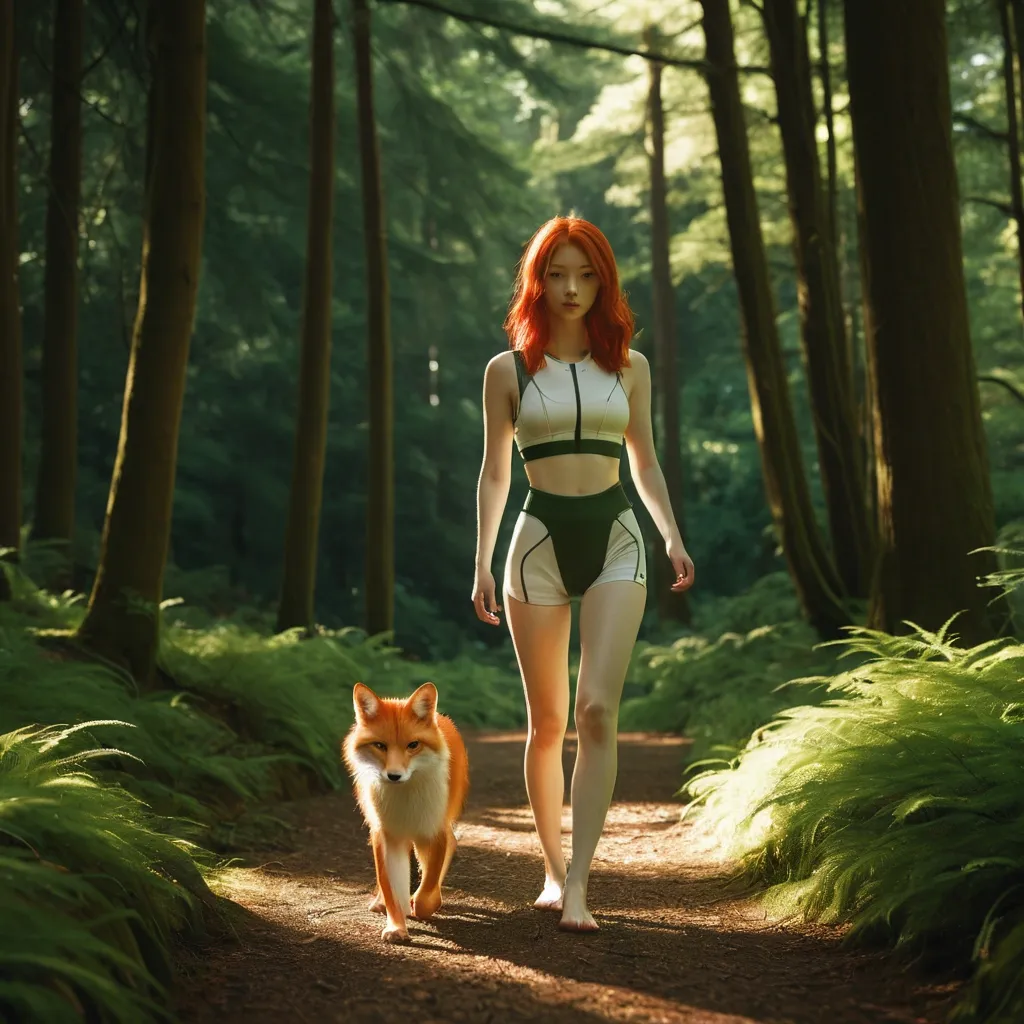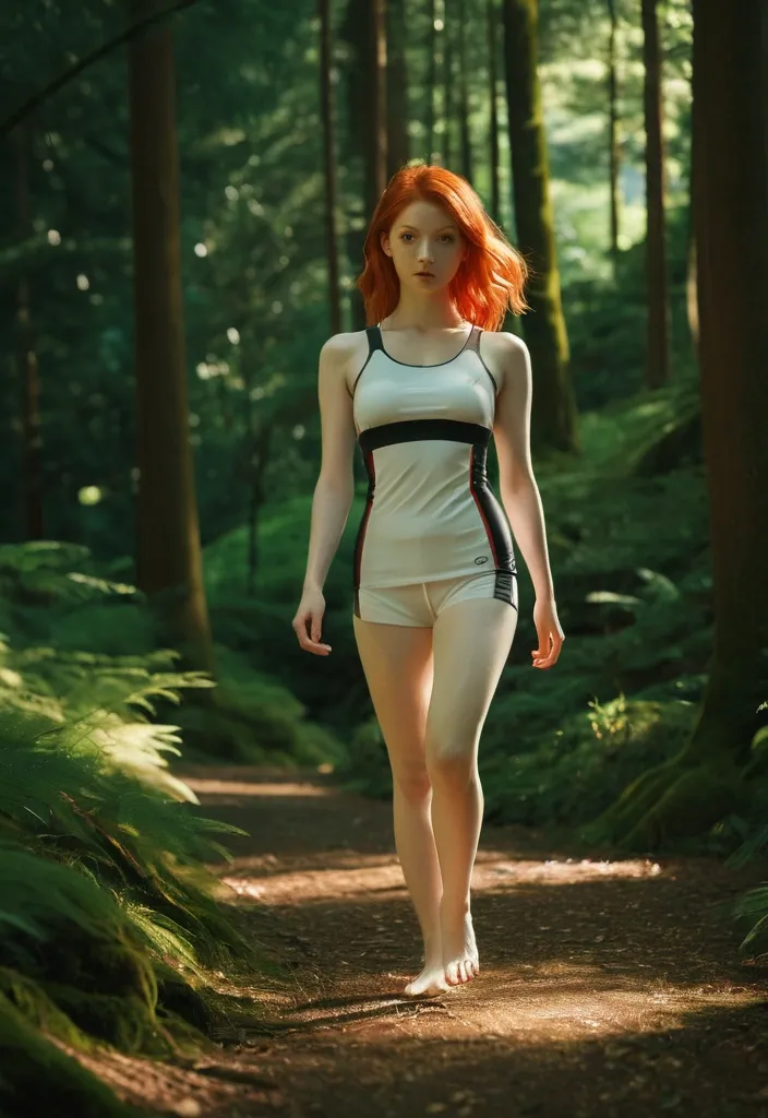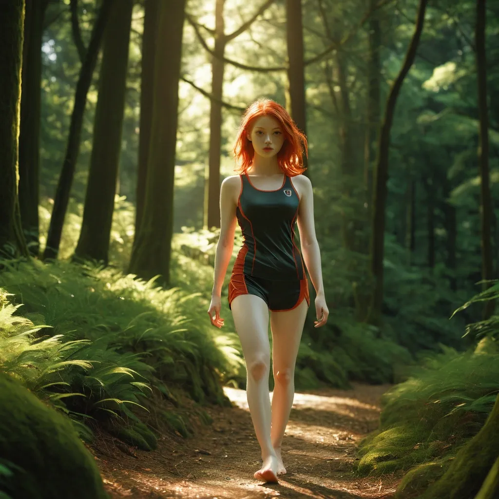 Photorealistic full-length depiction of a 25-year-old beautiful pale redhead european face kitsune wearing sleek sport mini outfits , barefoot , walking in a serene Japanese forest , surrounded by lush green trees and vibrant foliage , with the warm sunlight casting a gentle glow on her face , in a cinematic style , showcasing her striking red hair , with intricate details on her sportswear and the forest surroundings , capturing the intimate moment ,