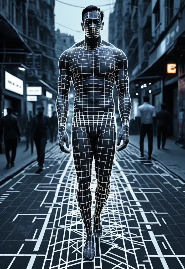 A Deconstructed Designs of Indian man walk a man attached in the uploaded reference image (Keep face of person 100% accurate from the reference image) , placed on a bury night street background. The man looks ultra-realistic , with perfect lighting and sharp details. Part of the man is deconstructed into small Deconstructed circuit pattern , as if pixelated , showing its textures and ingredients in a grid-like pattern. The circuit extend slightly outwards from the man , blending realism with abstract Electronic. Modern , artistic , high aesthetic street photography style. ,