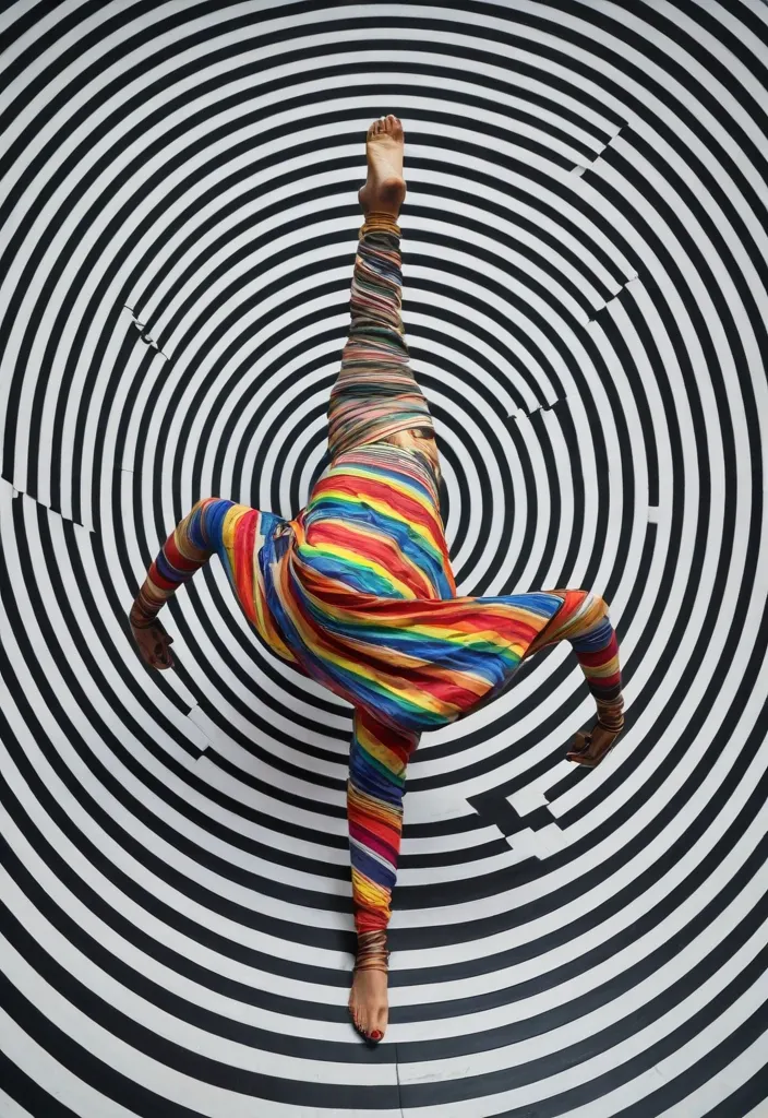 Phenomenal Upside-Down: Grounded perspective , down-top view , central subject , surreal scene of artwork , a women wearing a colorful Saree that is connected to stripes , a Saree spiral outward in all directions , creating a dramatic and visually striking effect. Legs in frame , parametric , multi-layered. ,