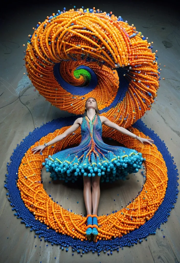 Phenomenal Upside-Down: Grounded perspective , down-top view , grand scale , central subject , surreal scene of artwork , a women wearing a dress that is connected to colorful strands , a dress spiral outward in all directions , creating a dramatic and visually striking effect. Bead blast and citrus blue Beads design , legs in frame , parametric , multi-layered ,