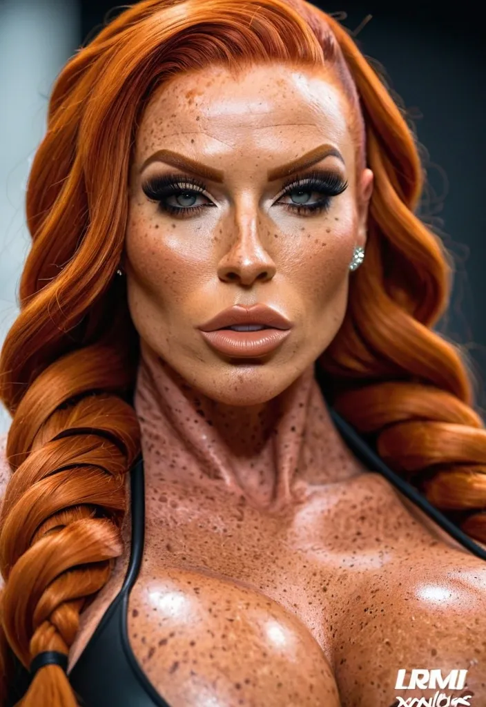 Generate Gorgeous female boss , bimbo , hourglass body , abnormally massive female bodybuilder , gorgeous , close up , full lips , big booty , redheaded , freckles on face and breast , braided design hair , feminine silhouette , too big breast , big booty , sexy thighs abs , silhouette , up close , flexing biceps , beautiful green eyes , legs are iconic and defining physical feature , both visually and in terms of combat ability.wearing an outfit that is a striking blend of elegance , power , and femininity , designed to command attention in any room. The suit is tailored to perfection , hugging the wearer’s curves with precision while emphasizing a structured silhouette. The fabric itself is a refined grey tweed patterned with subtle white grid lines , giving the suit a texture that feels both sophisticated and modern. The blazer features broad blue lapels and gold button accents , adding a luxurious touch that elevates the look beyond typical business attire. The matching high-waisted trousers elongate the frame , further enhancing the poised and commanding effect of the ensemble.The styling choices amplify the boldness of the suit. The inner blouse is a silky , greybutton-down shirt that complements the tweed’s tone while introducing a softer , feminine balance to the sharp tailoring of the jacket. The blouse peeks out neatly from under the blazer , maintaining elegance without drawing focus away from the suit’s commanding cut. Accessories are kept minimal yet intentional: a delicate layered gold necklace and hoop earrings that add glimmers of light and luxury without overpowering the outfit. The choice of voluminous , honey-brown braids cascading down her shoulders frames the face with both confidence and glamour , completing the commanding visual.Altogether , this look communicates a blend of authority and allure. It is business-ready yet fashion-forward , balancing corporate structure with vibrant femininity. The color palette blue , grey and gold avoids being overly delicate , instead embracing the richness of texture , structure , and presence. This is the kind of ensemble that speaks to ambition , sophistication , and personal style—ideal for someone who thrives in positions of influence but insists on expressing her individuality with bold elegance. It’s not just clothing—it’s a statement of power wrapped in grace. In luxury living legs that could crush a watermelon , skirt high boots are a bold and striking statement piece , crafted in glossy black patent leather that gives them a sleek , polished finish. Rising to just below the knee , the boots feature three adjustable buckle straps along the shaft , adding both edge and detail to their design. The towering stiletto heel , paired with a thick platform sole , creates an ultra-dramatic silhouette that elongates the leg and exudes power and confidence. With their combination of shine , height , and structure , these boots perfectly balance fierce femininity with high-fashion allure. Scowl on face ,