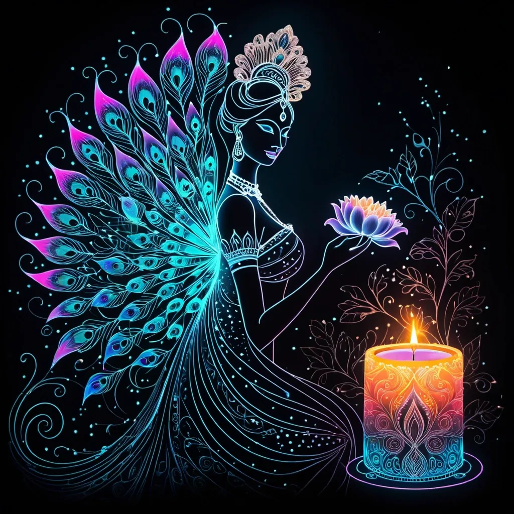 Minimalism , Impressionism , luminescence , neon glow , airbrushing , beautiful peacock feather abstract silhouette of a queen glowing , huge flowers , peonies in a spiral , New Year's fantasy , a large , thick burning candle with Madhubani painting style inside the candle , a beautiful queen , a very beautiful girl with a beautiful lily butterfly's , beautiful black glossy background , dotted-line , thin neon lines , silhouette of clubs of thick white smoke turning into flowing ,