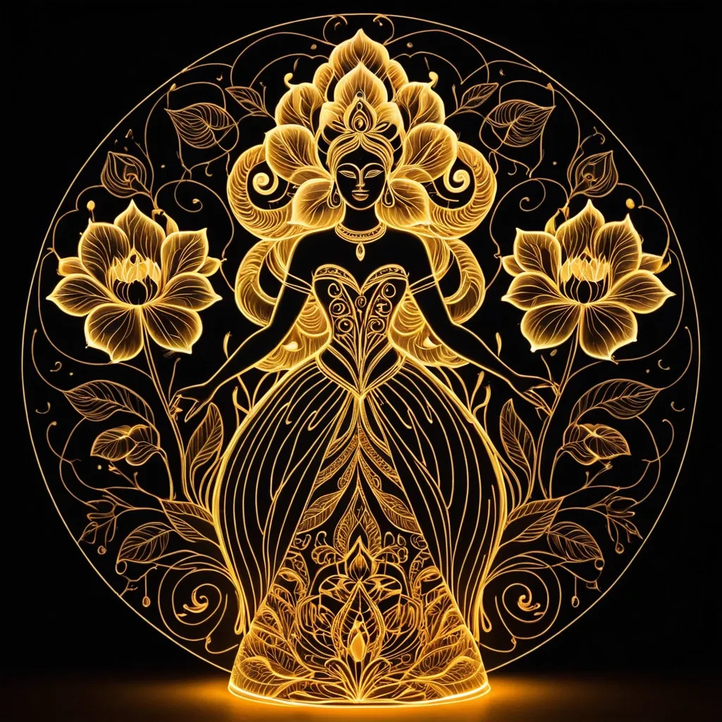 Minimalism , Impressionism , luminescence , neon glow , airbrushing , beautiful golden abstract silhouette of a queen glowing , huge flowers , peonies in a spiral , New Year's fantasy , a large , thick burning candle with Madhubani art style inside the candle , a beautiful queen , Slavic fantasy paper 3D cut fig , silhouette of a very beautiful girl with a beautiful lily flower , beautiful black glossy background , sketch , outline , thin neon lines , silhouette of clubs of thick white smoke turning into flowing ,